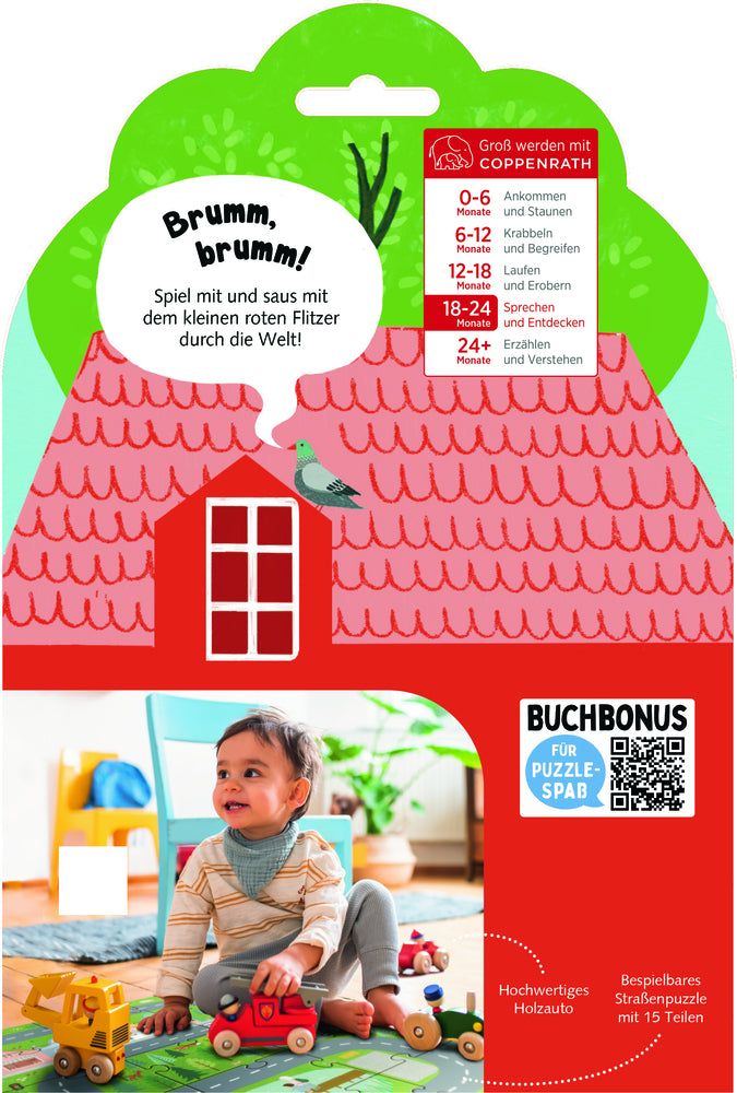 Brumm, brumm! Spiel mit und saus mit dem kleinen roten Flitzer durch die Welt! Dieser Klassiker verspricht unendlichen Spielspaß: mit hochwertigem Holzauto, einer bespielbaren Umverpackung, einer Puzzle-Straße mit 15 Teilen und einer ersten gereimten Geschichte. Dieses Pappbilderbuch mit Holzauto von Coppenrath ist doch ein tolles Mitbringsel für die Allerkleinsten.