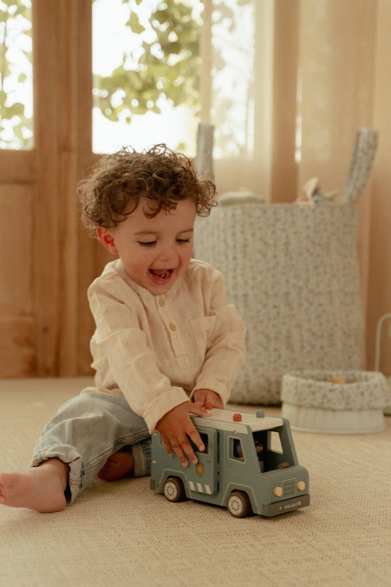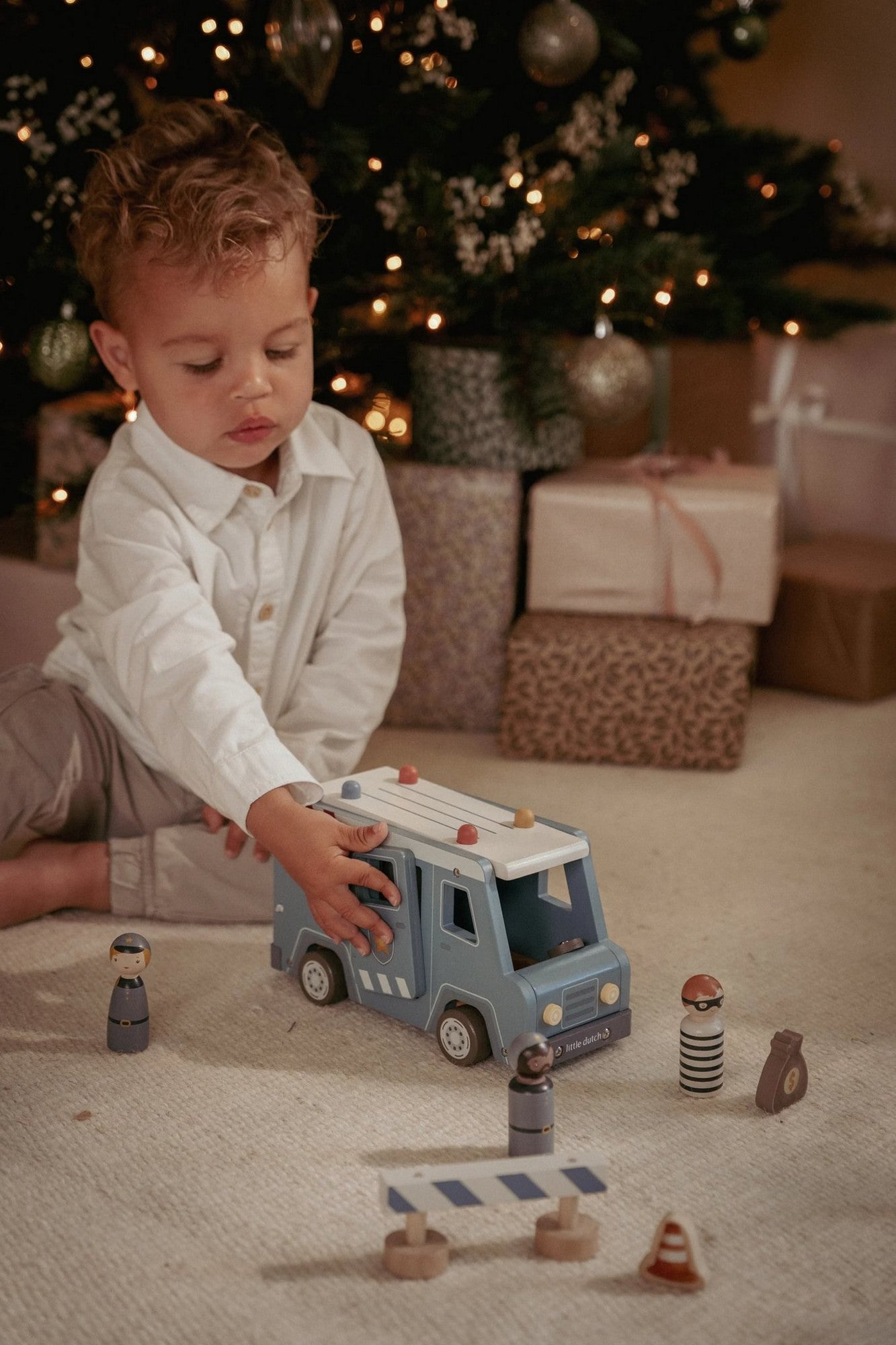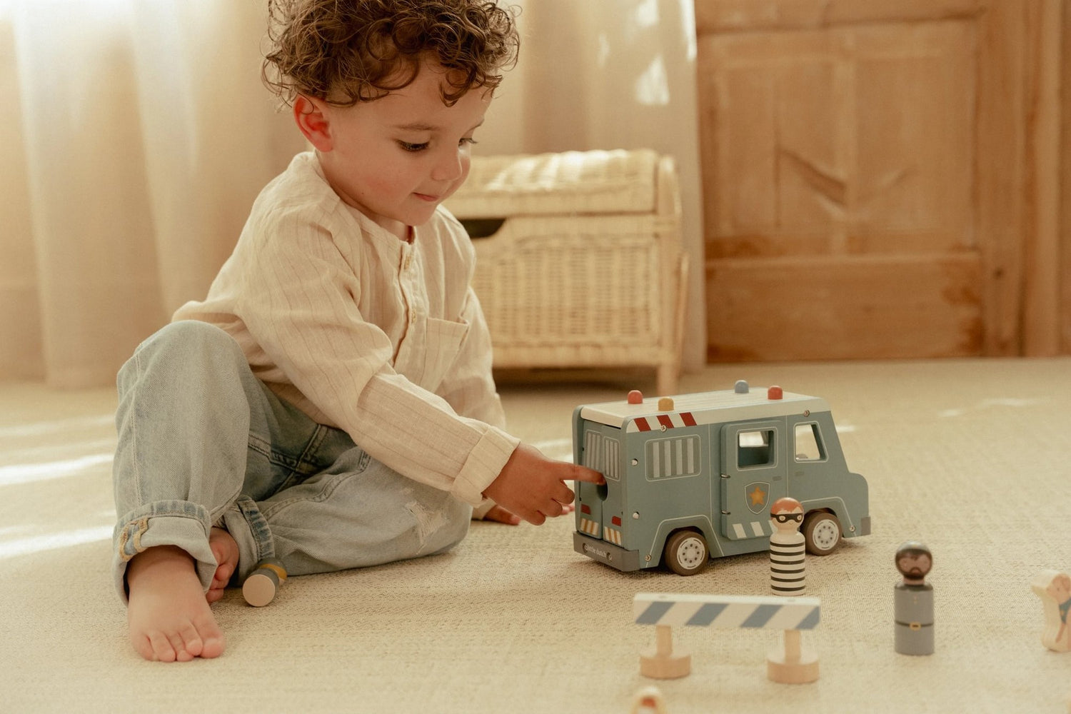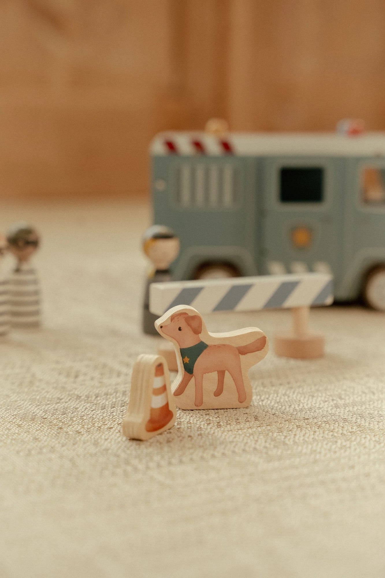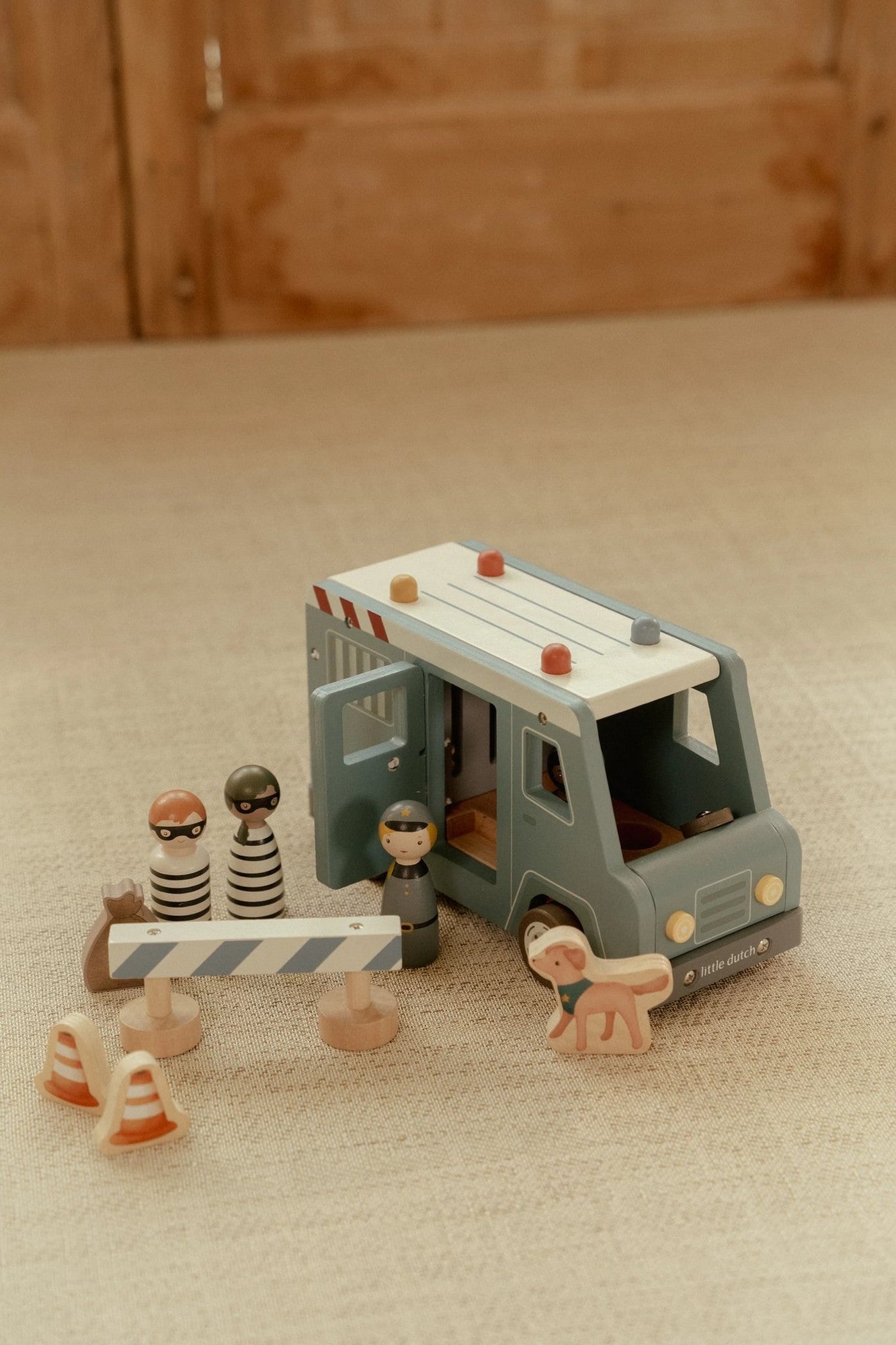 Verbrecher auf der Flucht? Kein Problem – mit diesem detailreichen Polizeiauto von Little Dutch, aus Holz ist die Ordnung schnell wiederhergestellt. Zwei Polizisten, zwei Verbrecher, ein treuer Polizeihund, ein Geldsack sowie Pylonen und eine Absperrung sorgen für spannende Einsätze. Die Zelle im Bus verfügt über eine klappbare Tür – ideal, um die Ganoven sicher hinter Gitter zu bringen.