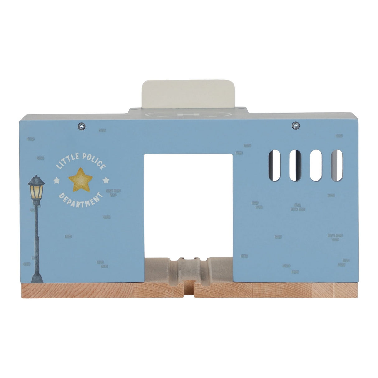 Verbrecher gesichtet – der Einsatz beginnt! Diese detailreich gestaltete Polizeistation von Little Dutch aus Holz bringt jede Menge Action ins Kinderzimmer. Mit dabei: Polizeiauto, Hubschrauber, Polizist, Verbrecher und ein mutiger Polizeihund. Die Zelle mit Gitterstäben sorgt für Ordnung, und auf der Landeplattform wartet der Helikopter auf den nächsten Start.