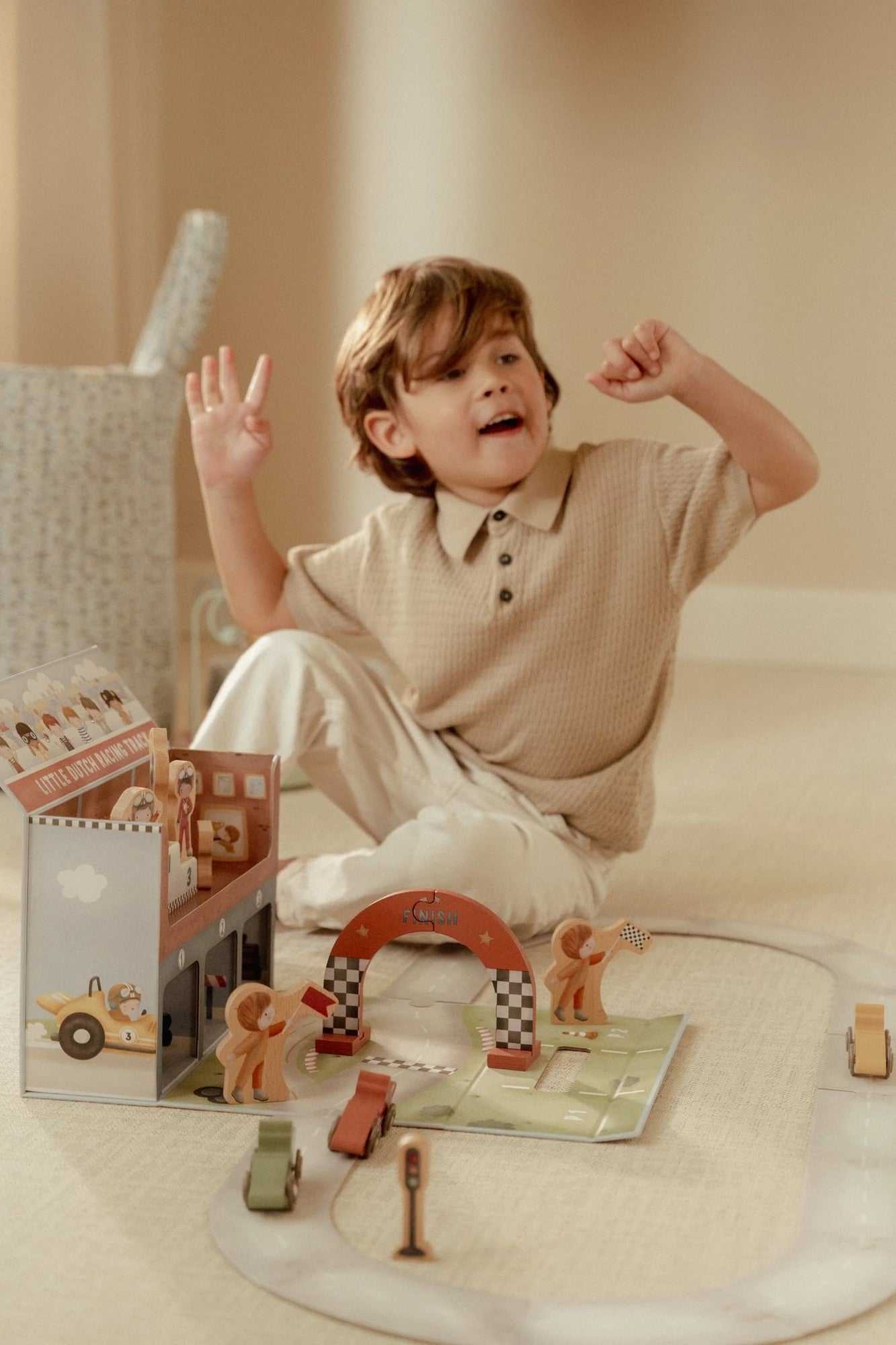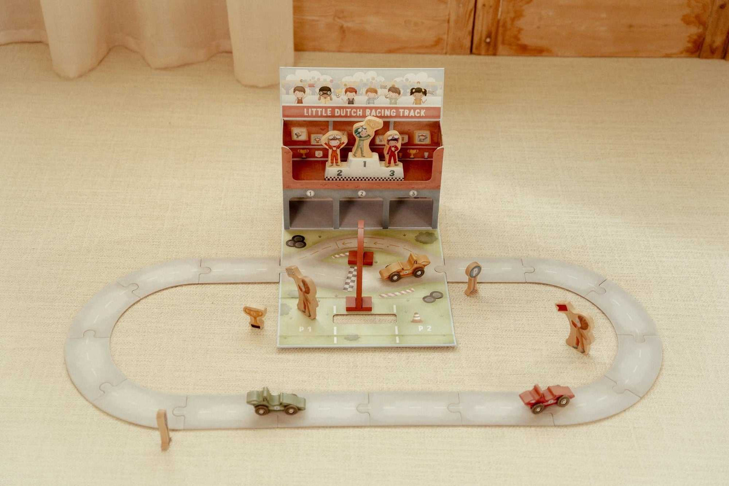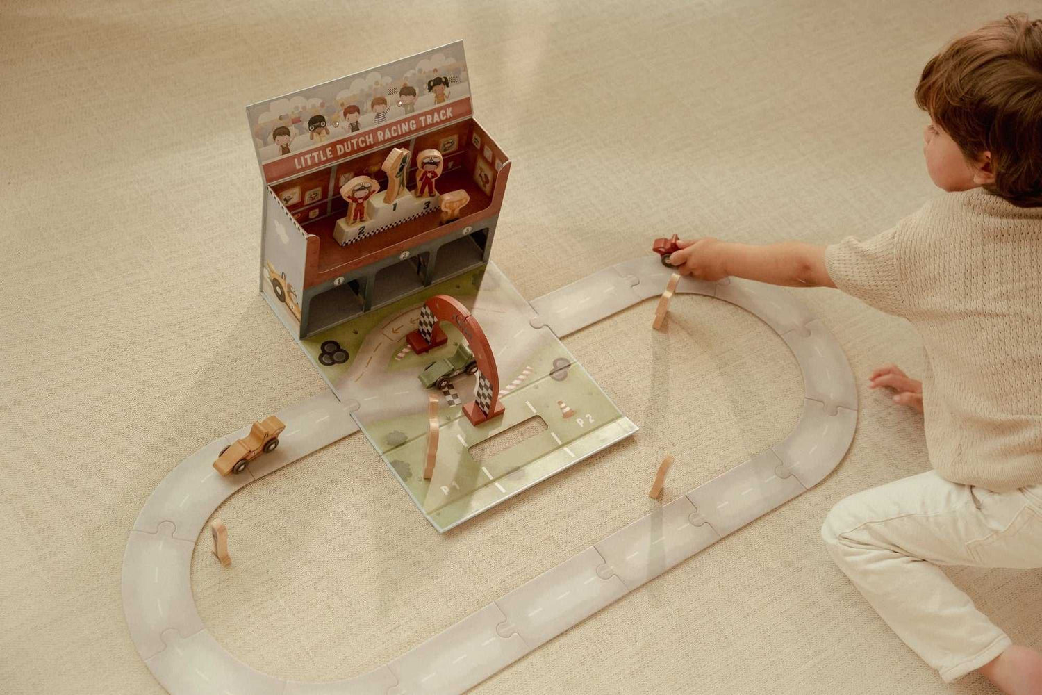 Start frei für kleine Motorsport-Fans: Das Modell „Rennstrecke im Koffer“ von Little Dutch, verwandelt sich im Handumdrehen in eine detailreiche Rennstrecke. Einfach auspacken, zusammenbauen und losfahren – ganz ohne Werkzeug.