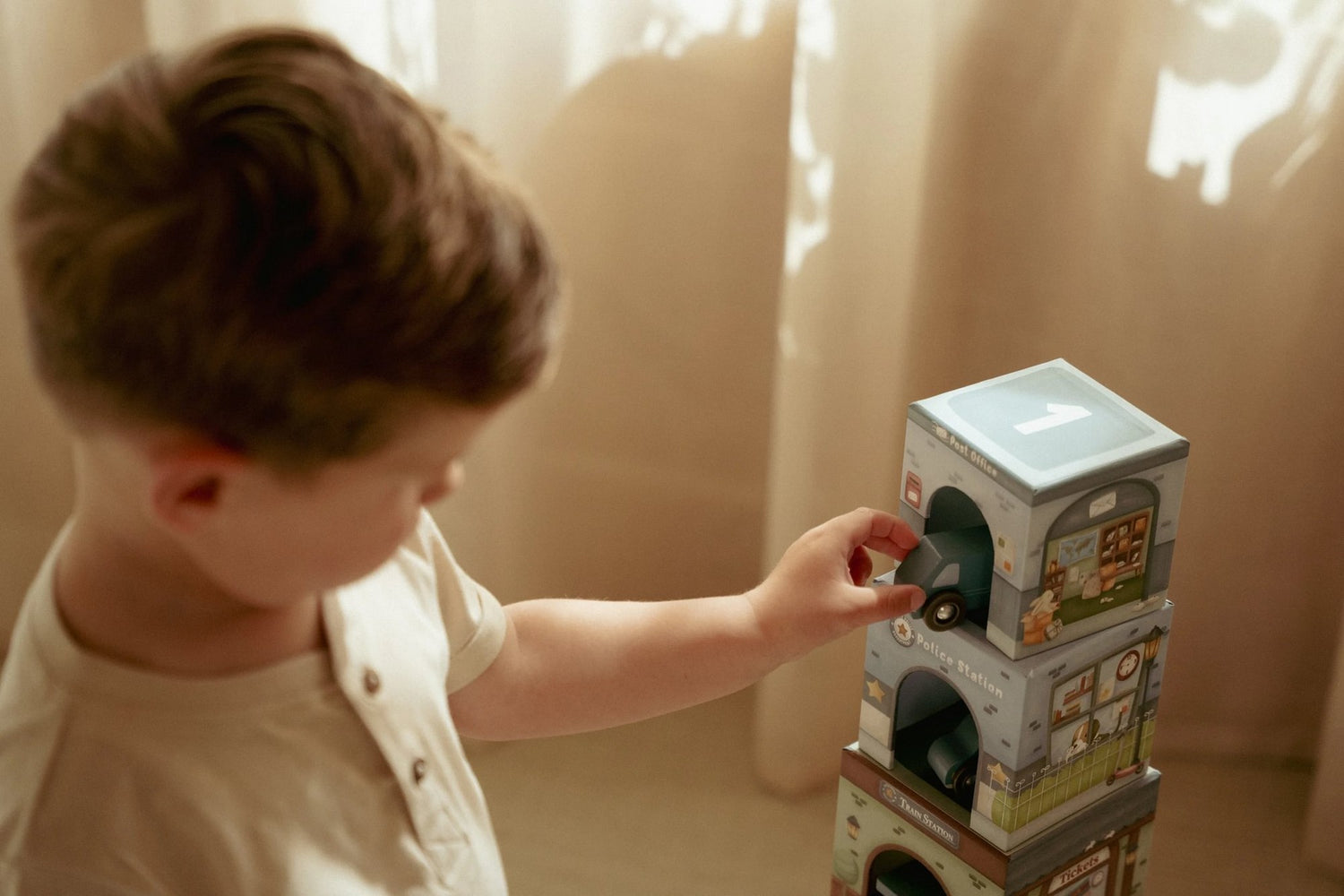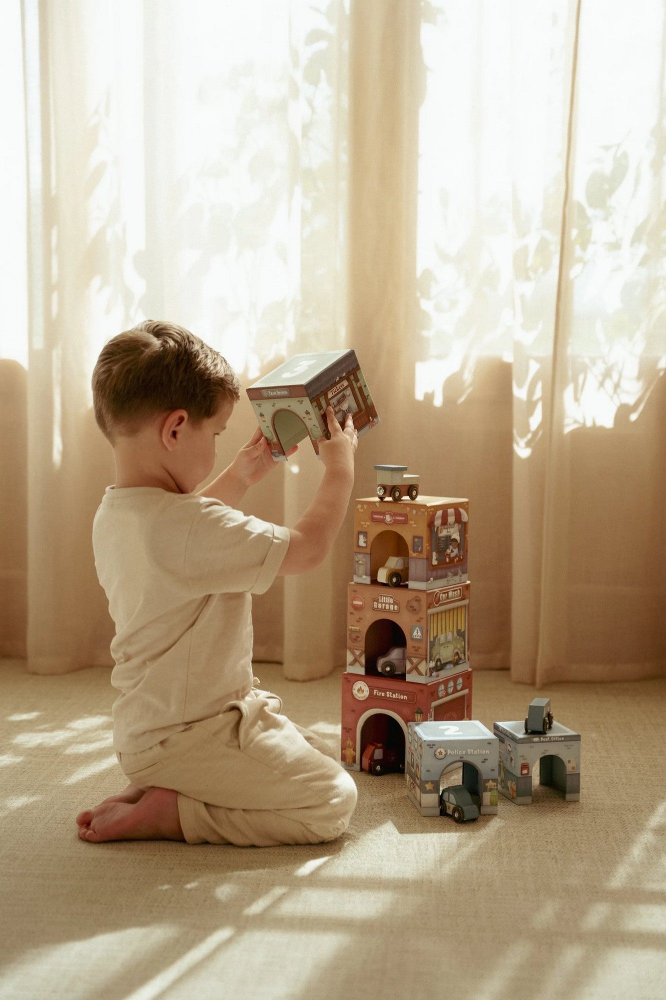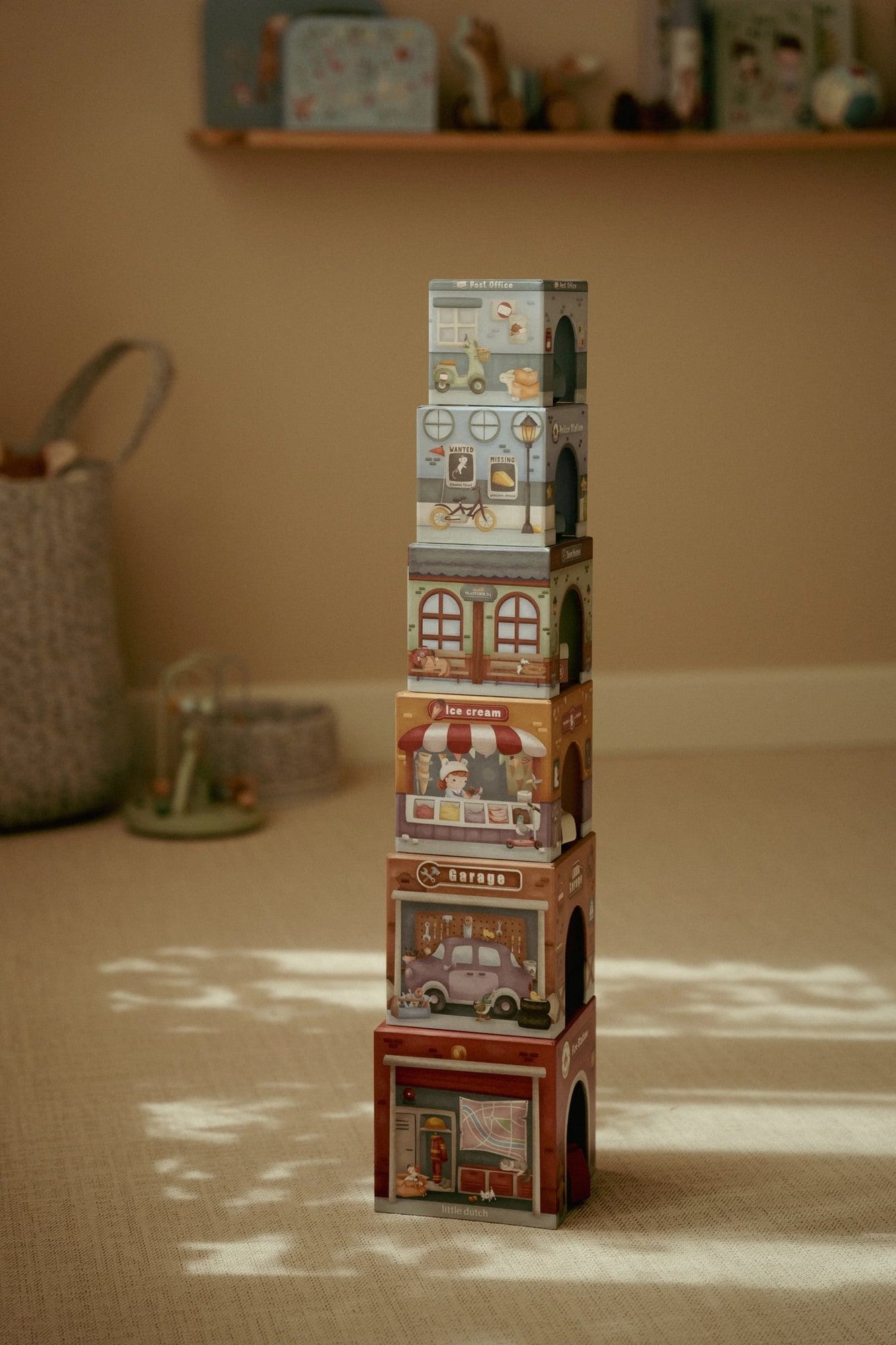 Stapeln, bauen und losfahren! Dieses farbenfrohe Set aus sechs stabilen Kartonblöcken von Little Dutch, mit passenden Holzfahrzeugen bringt Bewegung ins Kinderzimmer. Jeder Block zeigt liebevolle Illustrationen und beherbergt ein passendes Fahrzeug – vom Traktor bis zum Bus. Ob als hoher Turm gestapelt oder als kleine Stadt mit Tunneln und Durchfahrten bespielt – der Fantasie sind keine Grenzen gesetzt.