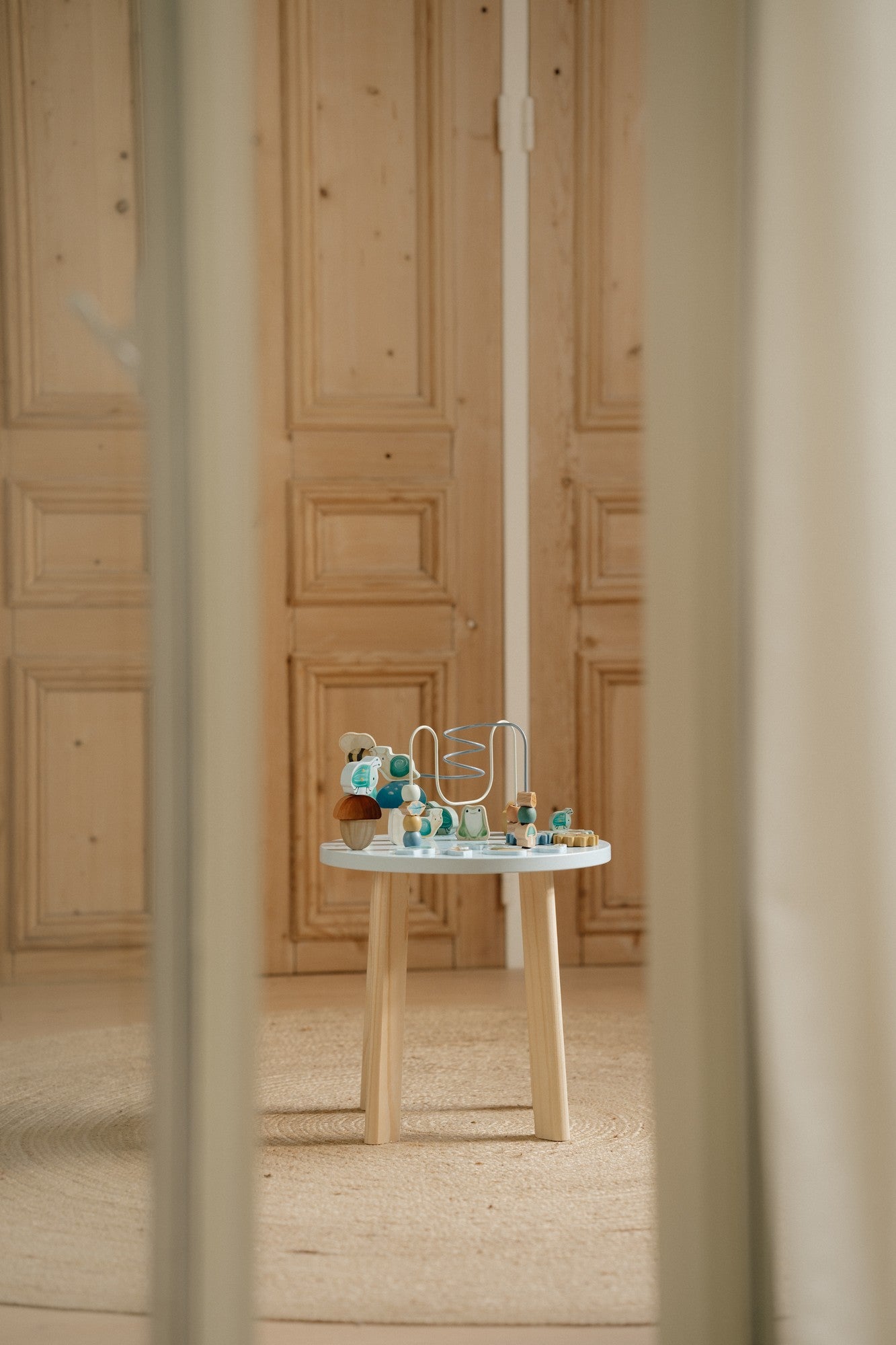 Entdecken Sie die vielen Aktivitäten, die dieser Tisch zu bieten hat. Bringe die Perlen entlang der Spirale von einer Seite des Zauberwaldes zur anderen.