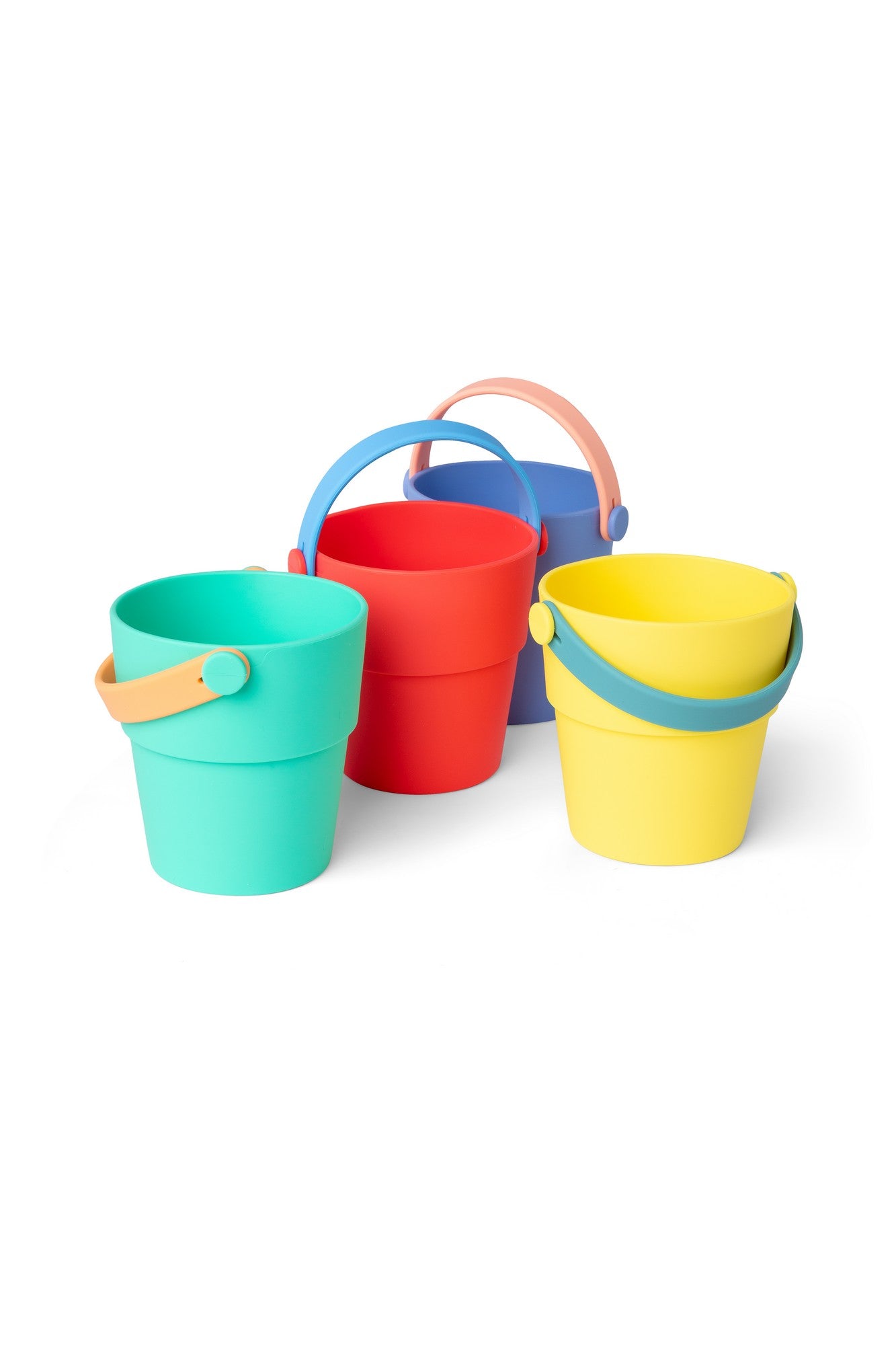 Die Eimer kommen in vier verschiedenen Farben - grün, rot, gelb und blau - und sind perfekt zum Stapeln, Spielen im Sand oder im Wasser geeignet.