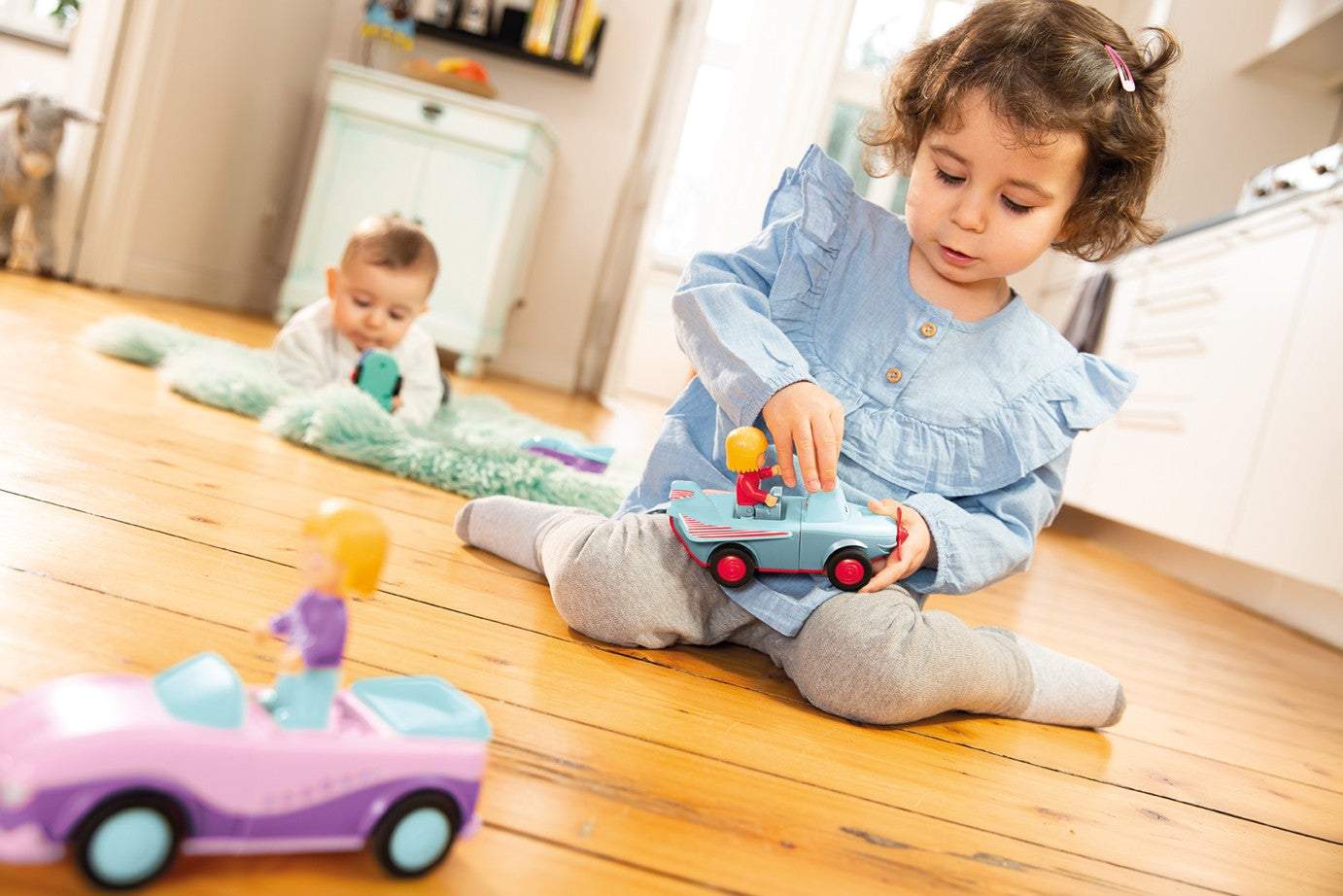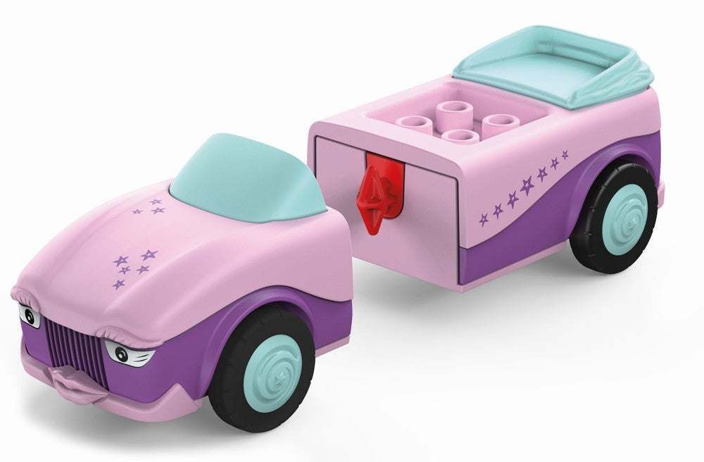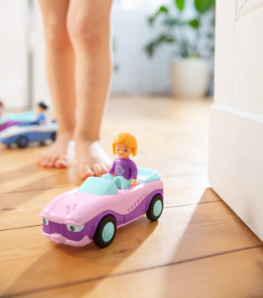 Die Spielfigur ist beweglich, das Fahrzeug lässt sich in 2 Teile zerlegen und kann mit anderen Toddys- Fahrzeugen kombiniert werden, durch das Dreh- Steck- System ist das kinderleicht.