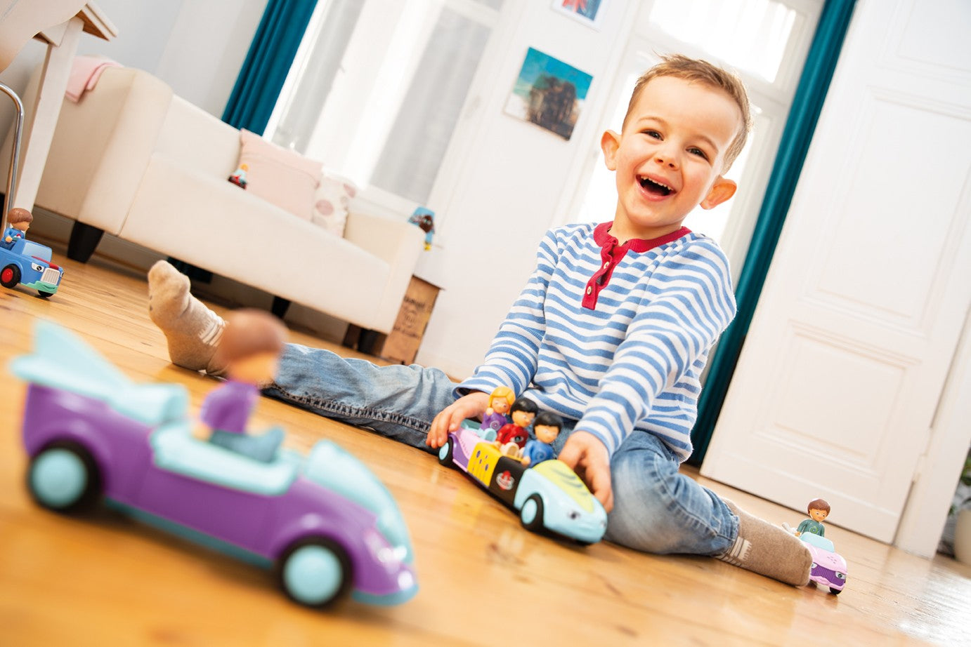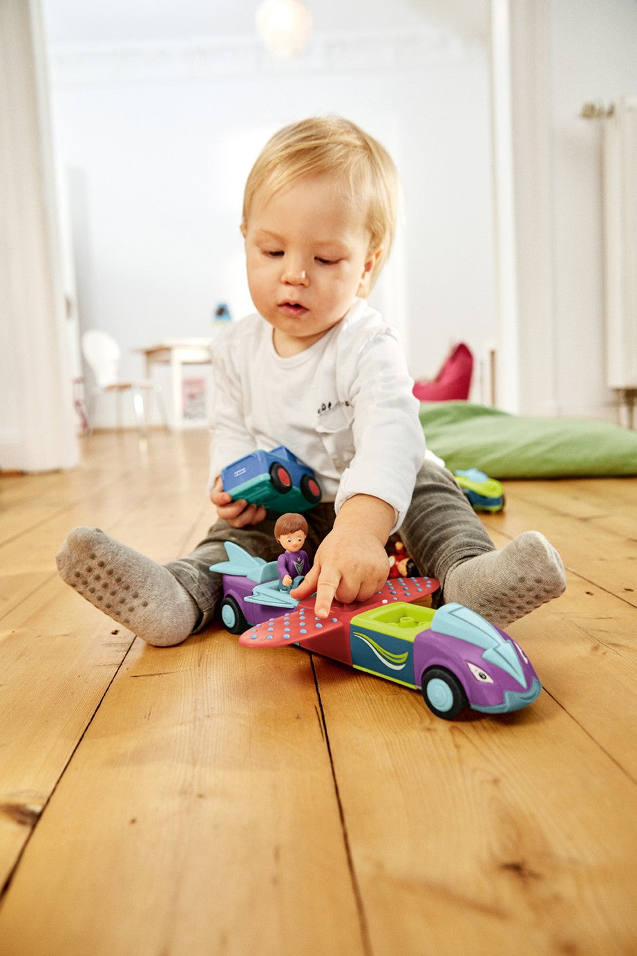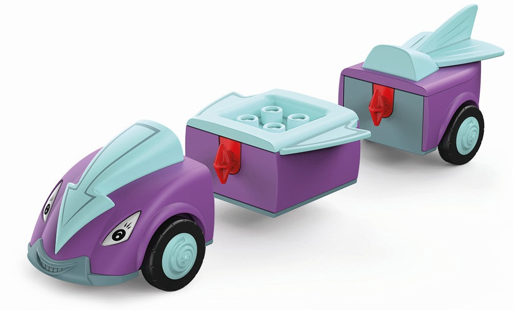 Die Spielfigur ist beweglich und das Fahrzeug lässt sich in 3 Teile zerlegen und kann mit anderen Toddys- Fahrzeugen kombiniert werden. Durch das Dreh- Steck- System ist das kinderleicht.