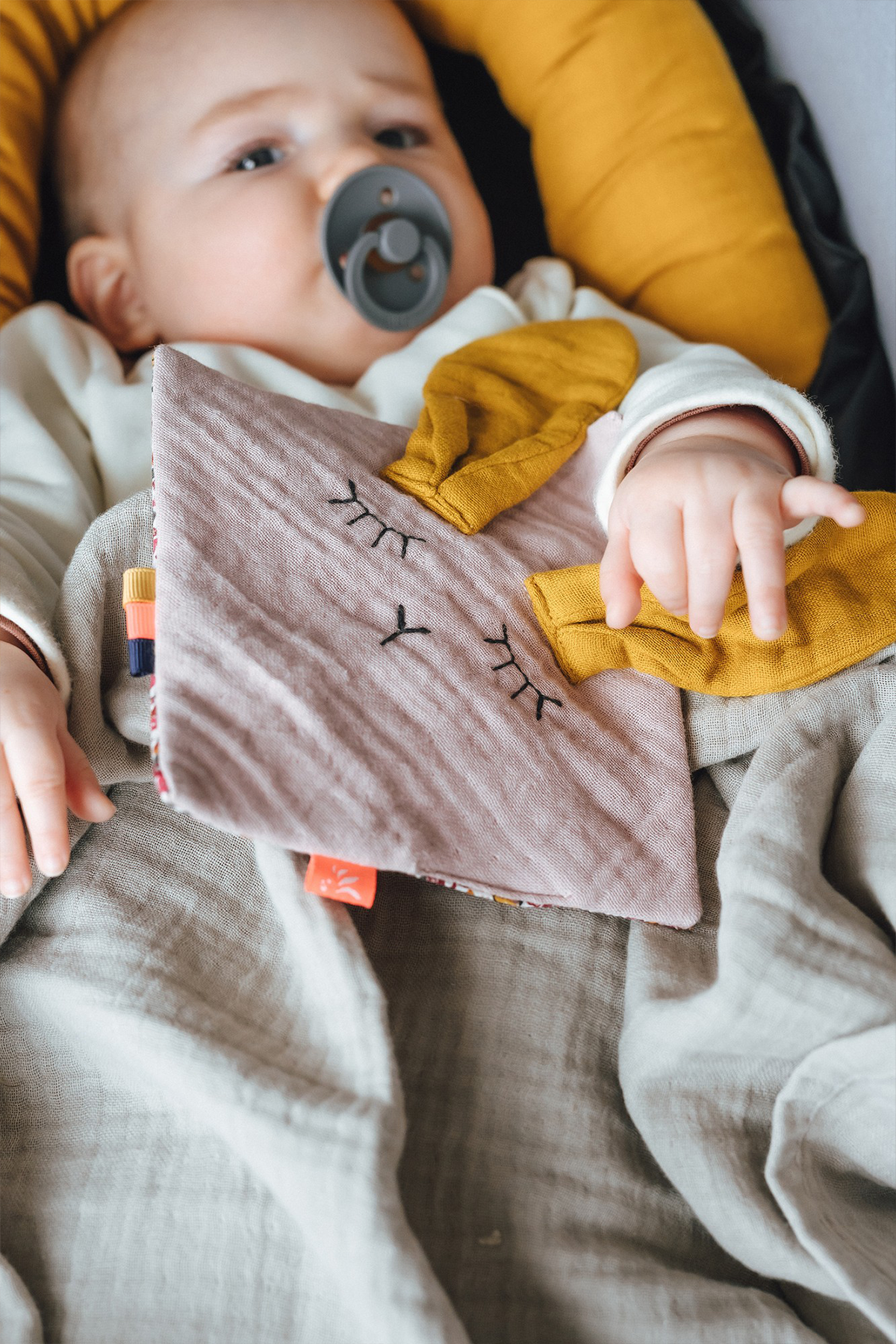 Das Knisterbuch von Kikadu hat süße Hasenohren und fördert auf spielerische Art und Weise die Feinmotorik Ihres Babys.