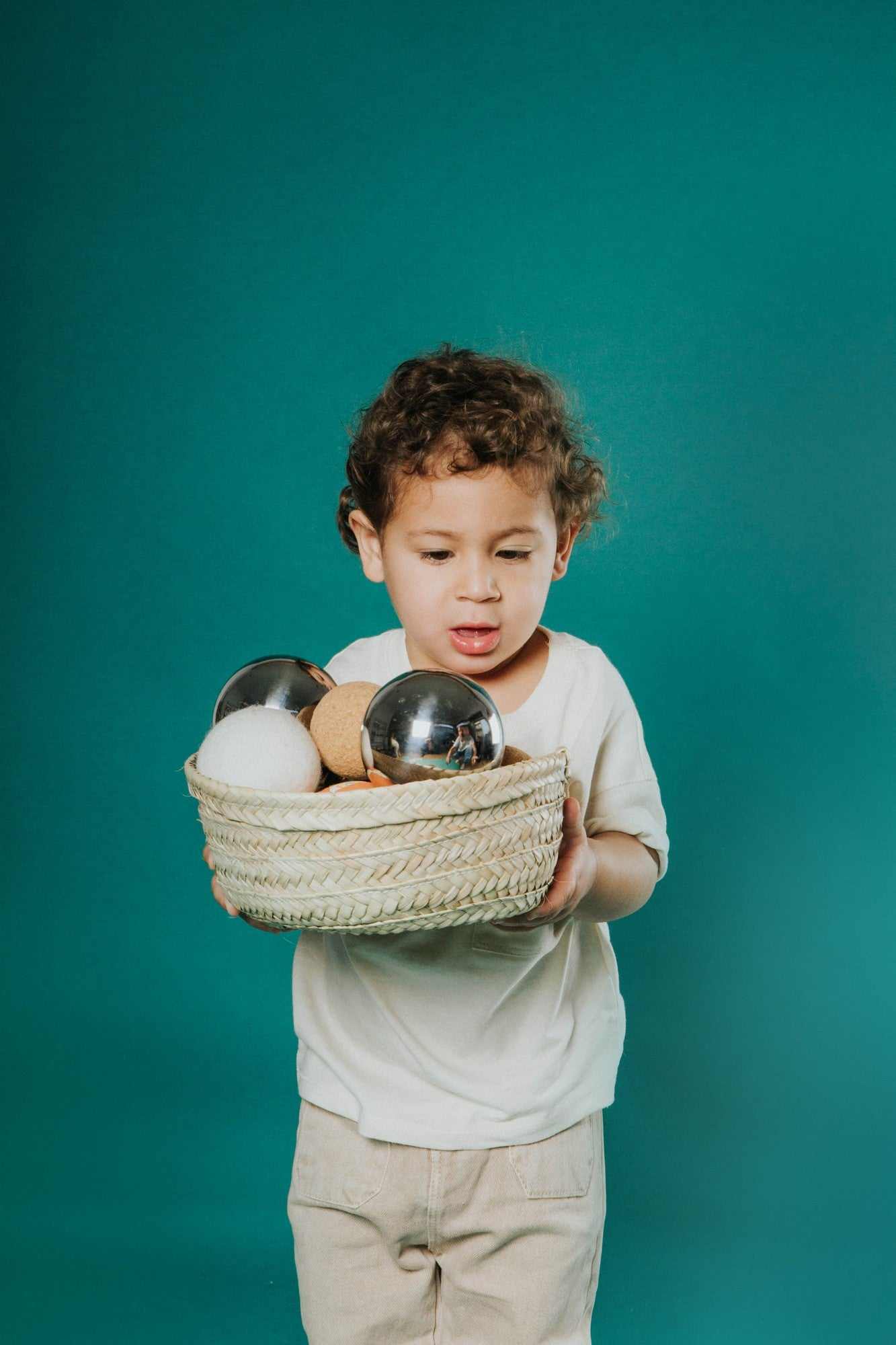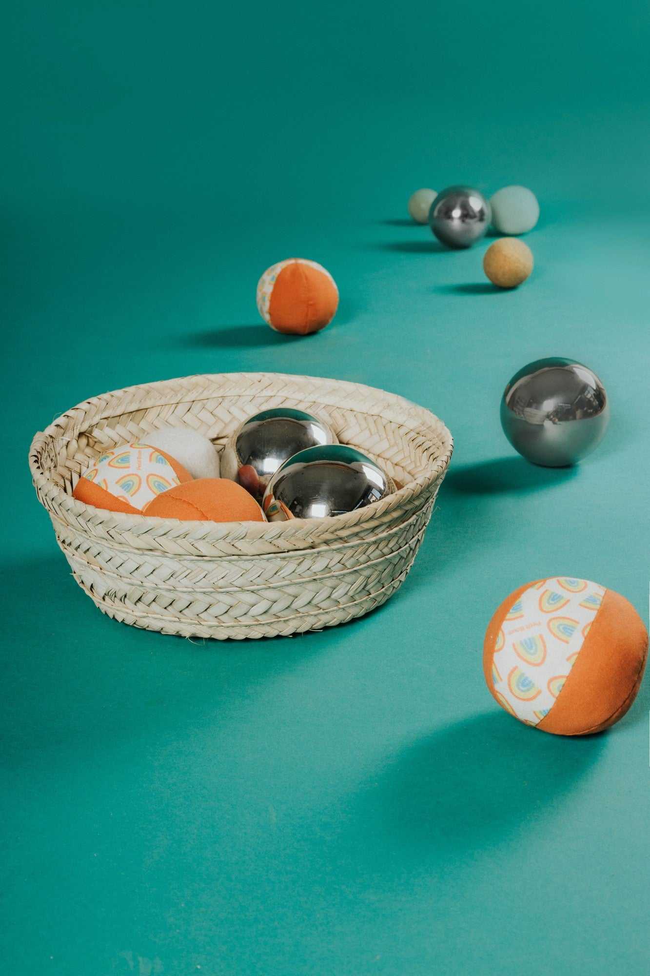 Jeder Ball besteht aus einem anderen natürlichen Material - Metall, Holz, Wolle, Kork und Baumwolle - und unterscheidet sich in Gewicht, Größe, Temperatur und Textur.