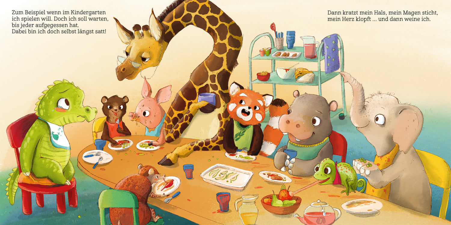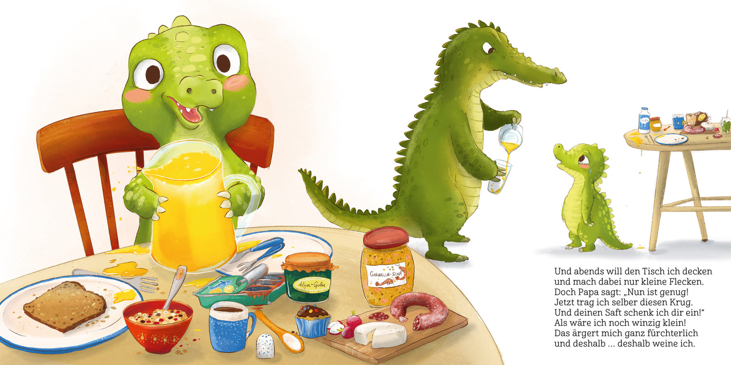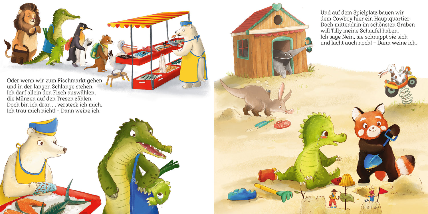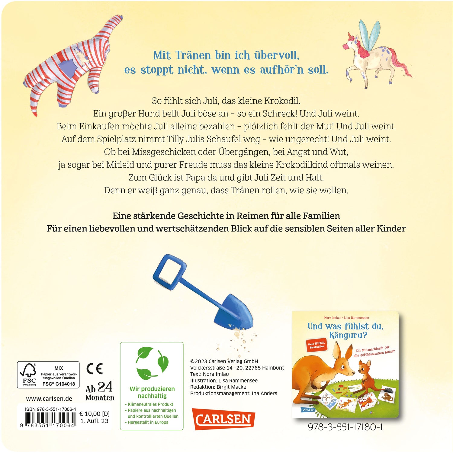 Wunderbar stärkende Reimgeschichte von Ars Edition mit einem wertschätzenden und liebevollen Blick auf die sensiblen Seiten aller Kinder »Mit Tränen bin ich übervoll, es stoppt nicht, wenn es aufhör'n soll.« So fühlt sich Juli, das kleine Krokodil. Trotz der dicken Krokodilshaut wirkt Juli etwas dünnhäutig, nah am Wasser gebaut. Ein großer Hund bellt Juli böse an. So ein Schreck! Und Juli weint. Beim Einkaufen möchte Juli alleine bezahlen ... Plötzlich fehlt der Mut! Und Juli weint. Auf dem Spielplatz nimmt Tilly Julis Schaufel weg. Wie ungerecht! Und Juli weint. Ob bei Missgeschicken oder Übergängen, bei Angst und Wut, ja sogar bei Mitleid und purer Freude muss das kleine Krokodilkind oftmals weinen. Zum Glück ist Papa da und gibt Juli Zeit, Raum und Halt. Denn er weiß ganz genau, dass Tränen rollen, wie sie wollen und das kleine Krokodil ein Kuschelnest braucht damit die Tränen mit der Zeit weniger werden können. Das Weinen ist für ein so wunderbar empfindsames Kind wie Juli ein Ventil, um sein Erlebtes und Gefühltes zu verarbeiten. Mit dieser hilfreichen Geschichte in Reimen und liebevollen Bildern können Sie Ihrem Kind Mut machen und es mit all seinen empfindsamen Seiten ernst nehmen. Nach dem Bestseller-Erfolg von »Und was fühlst du, Känguru?« ein neues Pappbilderbuch von Familienexpertin Nora Imlau über die Gefühle und Bedürfnisse unserer Kinder und ihrer Begleitung durch uns Erwachsene. *Erleichtert die Eltern-Kind-Kommunikation für alle *Dynamisch erzählt in Reimen, die leicht ins Ohr gehen *Stärkt die Bindung, das Vertrauen und Selbstbewusstsein *Liebenswerte Identifikationsfigur ohne Geschlechtszuschreibung *Wichtiges Familienthema: Emotionale Entwicklung der Kinder begleiten *Ausdrucksstark, einfühlsam und mit viel Sinn für Fokus und Details illustriert *Authentische Vaterfigur für mehr Sichtbarkeit care-arbeitender Männer und Offenheit verschiedener Familienmodelle Seitenanzahl: 26 ISBN: 9783551170064 Maße: 20,1 x 20,0 x 2,2 cm