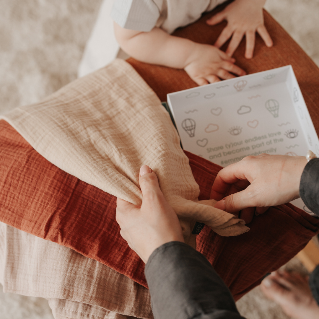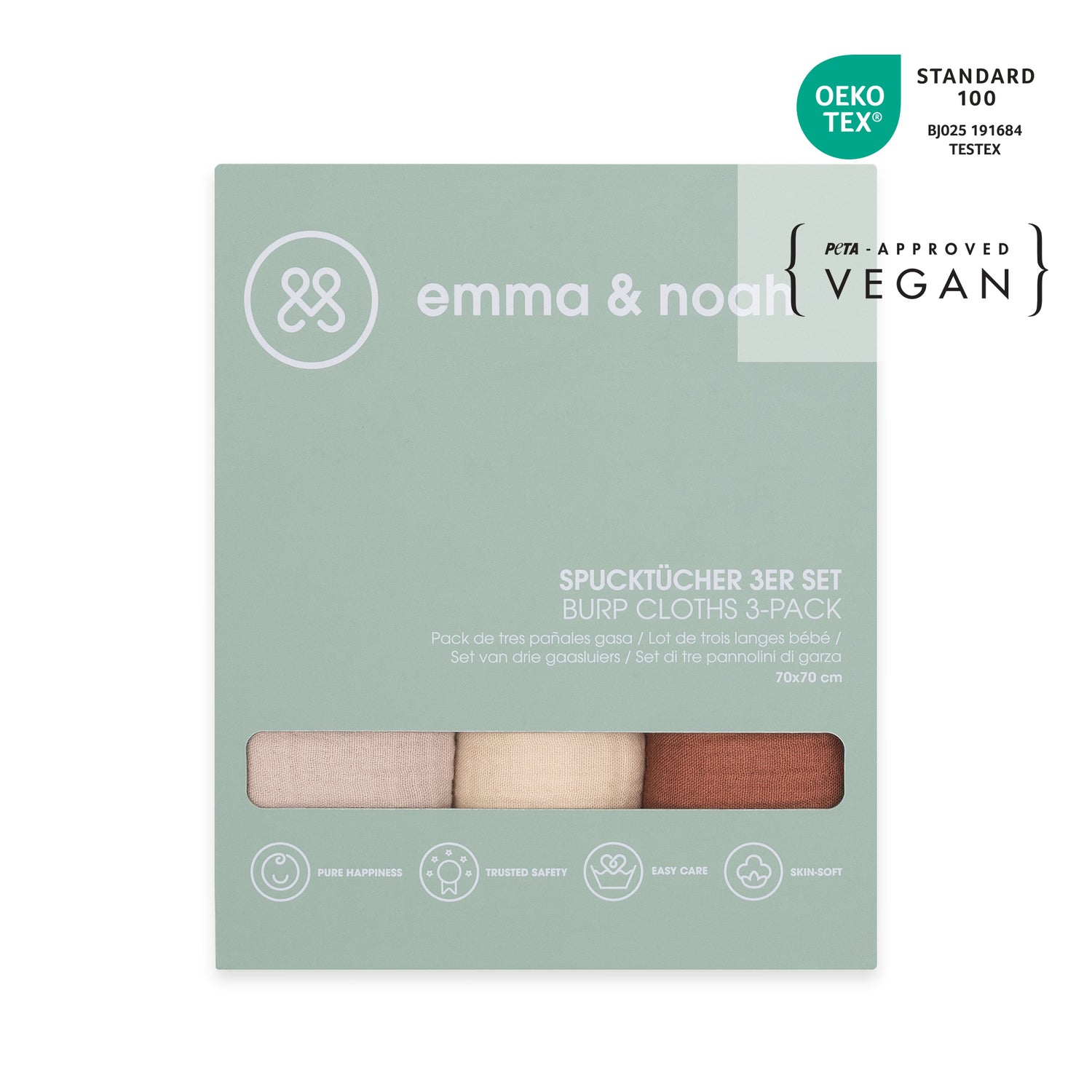 „Von Spucktüchern kann man nie genug haben!“ Jede Mama wird diesen Satz schon mal ausgesprochen haben. Durch ihre praktische Größe (70 x 70 cm) können die unverwechselbaren Emma & Noah Spucktücher im Alltag vielseitig genutzt werden. Dank der hohen Qualität und des zeitlosen Designs sind die Tücher ein idealer Begleiter für den Alltag mit Eurem Baby. Die Spucktücher bestehen aus 100% hautfreundlicher Bio-Baumwolle. Anders als gewöhnliche Spucktücher, sind sie sehr weich und flauschig verarbeitet und schmeicheln der zarten Haut Eures Babys. Der doppelt gewebte, saugfähige Baumwoll-Musselin Stoff der Spucktücher nimmt Flüssigkeit problemlos auf. Um der häufigen Nutzung im Alltag gerecht zu werden, sind die Spucktücher besonders sorgfältig verarbeitet. Die Tücher sind bereits vorgewaschen und alle Ränder sind doppelt umgeschlagen und sorgfältig vernäht. Dadurch fransen sie auch bei häufiger Wäsche nicht aus oder verziehen.