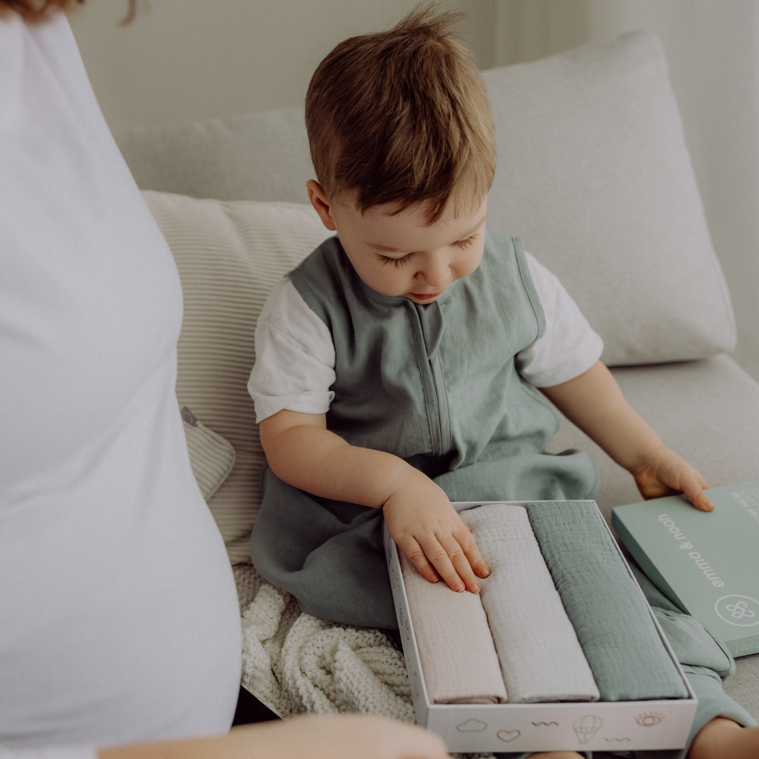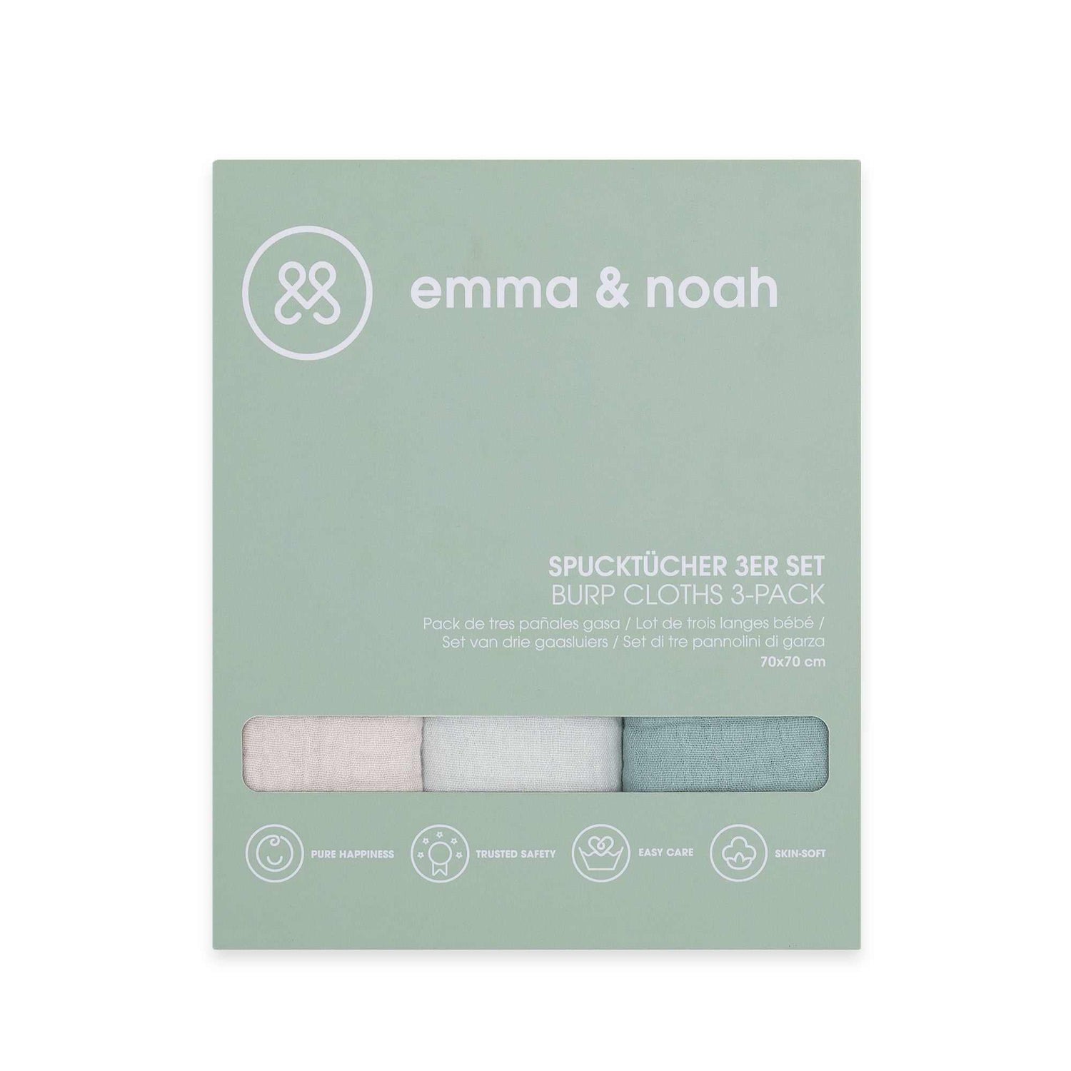 „Von Spucktüchern kann man nie genug haben!“ Jede Mama wird diesen Satz schon mal ausgesprochen haben. Durch ihre praktische Größe (70 x 70 cm) können die unverwechselbaren Emma & Noah Spucktücher im Alltag vielseitig genutzt werden. Dank der hohen Qualität und des zeitlosen Designs sind die Tücher ein idealer Begleiter für den Alltag mit Eurem Baby. Die Spucktücher bestehen aus 100% hautfreundlicher Bio-Baumwolle. Anders als gewöhnliche Spucktücher, sind sie sehr weich und flauschig verarbeitet und schmeicheln der zarten Haut Eures Babys. Der doppelt gewebte, saugfähige Baumwoll-Musselin Stoff der Spucktücher nimmt Flüssigkeit problemlos auf. Um der häufigen Nutzung im Alltag gerecht zu werden, sind die Spucktücher besonders sorgfältig verarbeitet. Die Tücher sind bereits vorgewaschen und alle Ränder sind doppelt umgeschlagen und sorgfältig vernäht. Dadurch fransen sie auch bei häufiger Wäsche nicht aus oder verziehen.