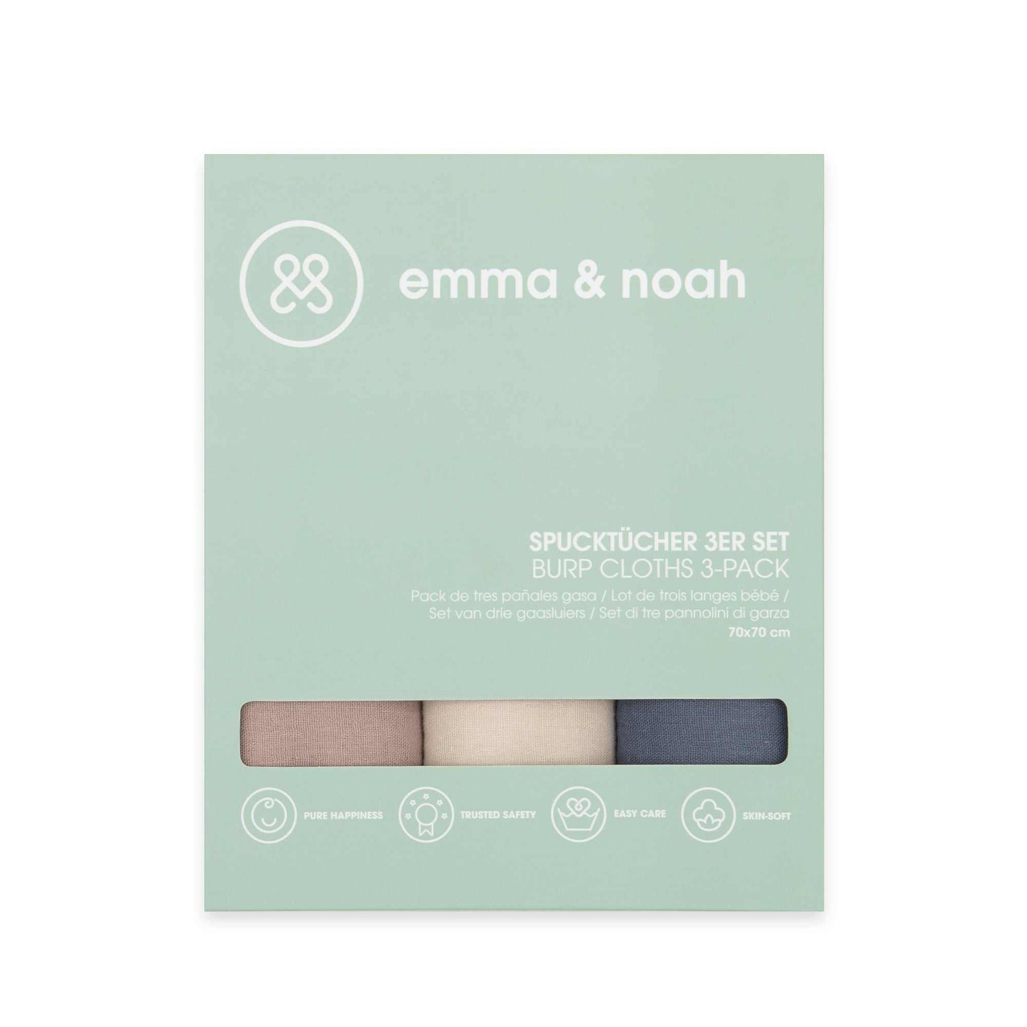 „Von Spucktüchern kann man nie genug haben!“ Jede Mama wird diesen Satz schon mal ausgesprochen haben. Durch ihre praktische Größe (70 x 70 cm) können die unverwechselbaren Emma & Noah Spucktücher im Alltag vielseitig genutzt werden. Dank der hohen Qualität und des zeitlosen Designs sind die Tücher ein idealer Begleiter für den Alltag mit Eurem Baby. Die Spucktücher bestehen aus 100% hautfreundlicher Bio-Baumwolle. Anders als gewöhnliche Spucktücher, sind sie sehr weich und flauschig verarbeitet und schmeicheln der zarten Haut Eures Babys. Der doppelt gewebte, saugfähige Baumwoll-Musselin Stoff der Spucktücher nimmt Flüssigkeit problemlos auf. Um der häufigen Nutzung im Alltag gerecht zu werden, sind die Spucktücher besonders sorgfältig verarbeitet. Die Tücher sind bereits vorgewaschen und alle Ränder sind doppelt umgeschlagen und sorgfältig vernäht. Dadurch fransen sie auch bei häufiger Wäsche nicht aus oder verziehen.