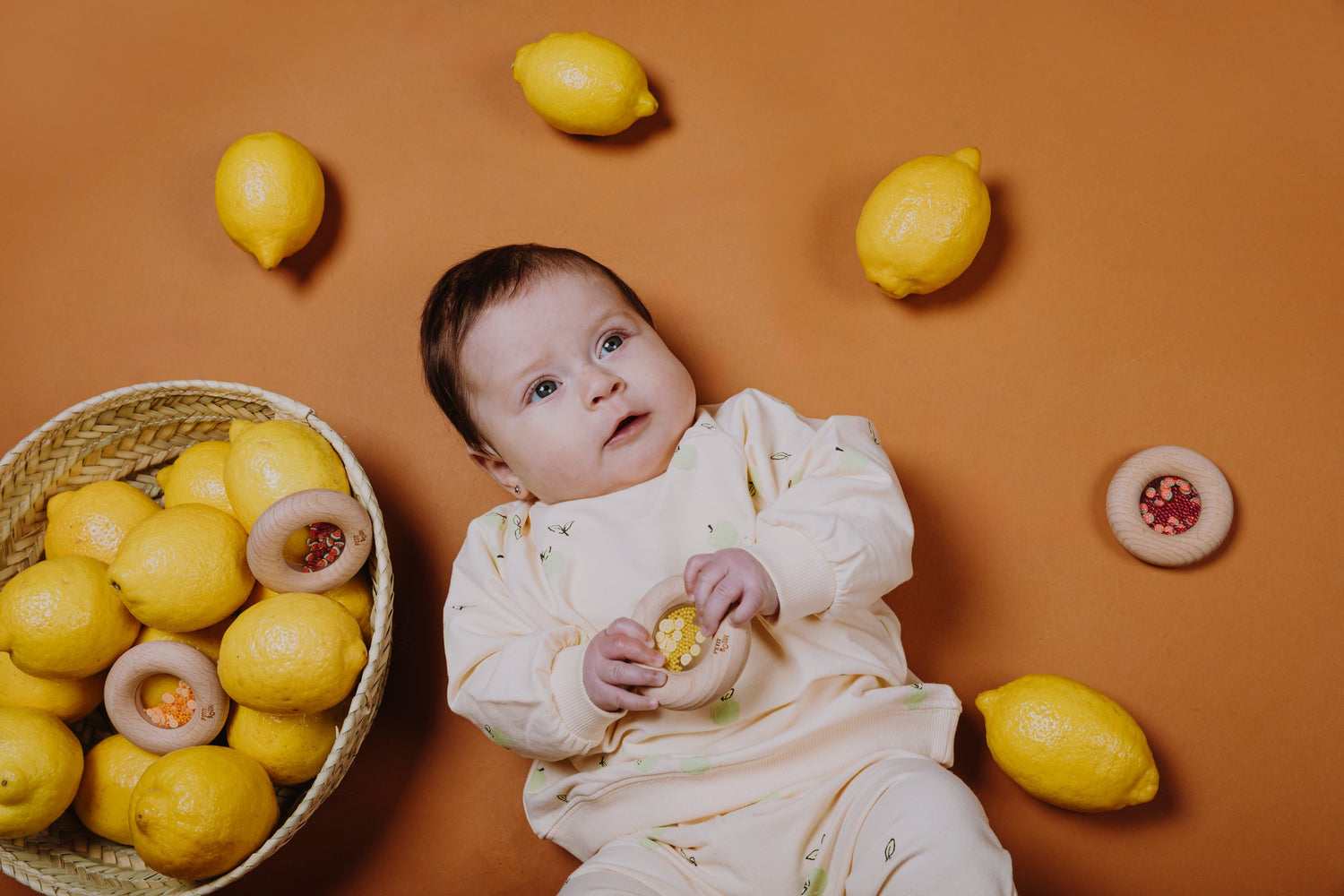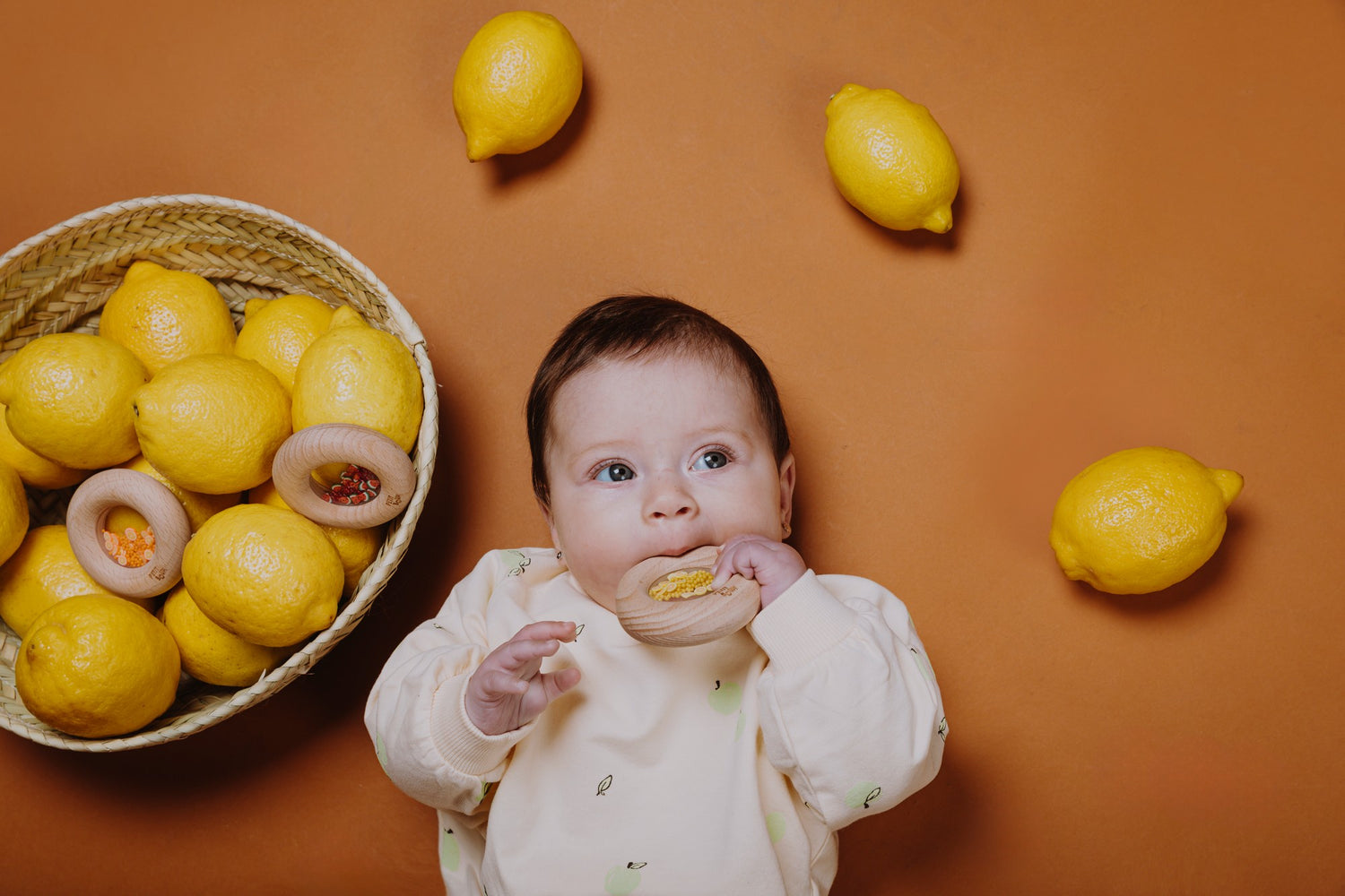 Die Petit Boum Sensory Donut-Zitronen ist ein niedliches Sensorikspielzeug, das mit sauren Zitronen gefüllt ist und zum Entdecken einlädt. Das Spielzeug ist perfekt für kleine Hände zum Greifen geeignet und besteht aus Buchenholz. Es sollte jedoch nicht in Wasser getaucht werden, sondern kann einfach mit einem feuchten Tuch abgewischt werden. Um die Langlebigkeit des Produkts zu gewährleisten, sollte es nicht zu lange direktem Sonnenlicht ausgesetzt werden.