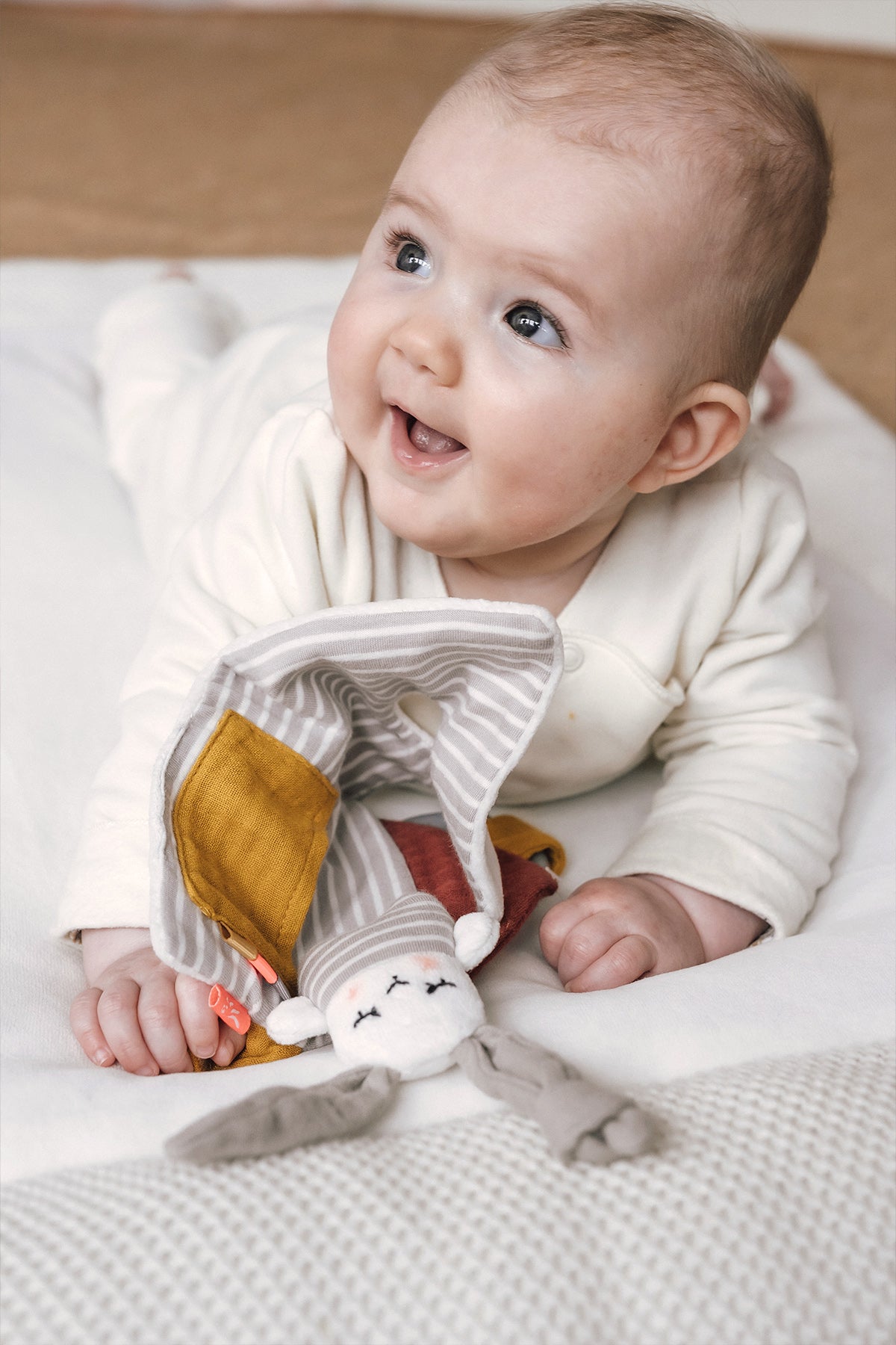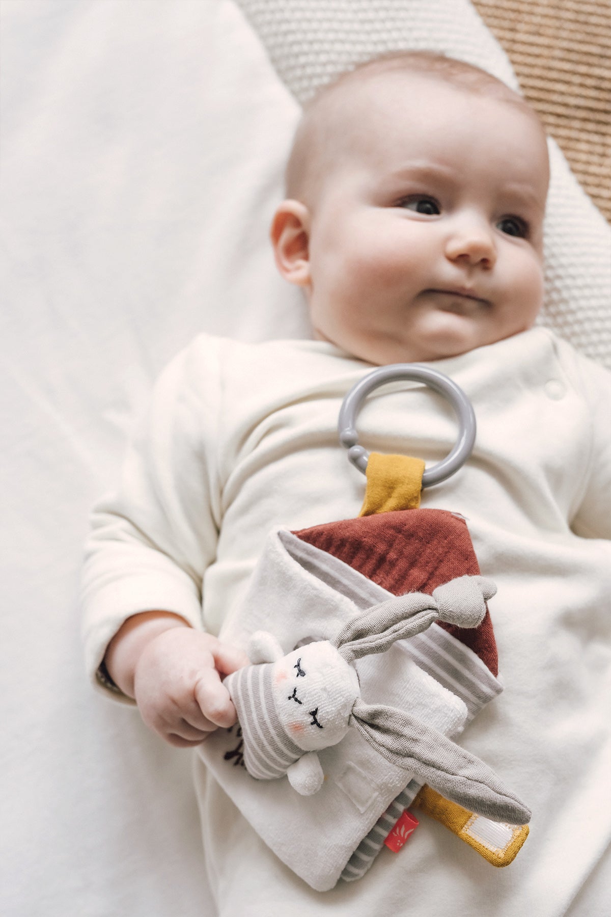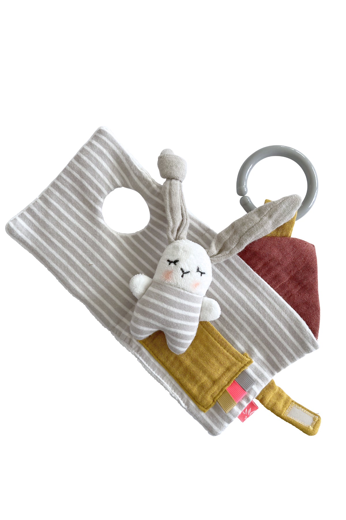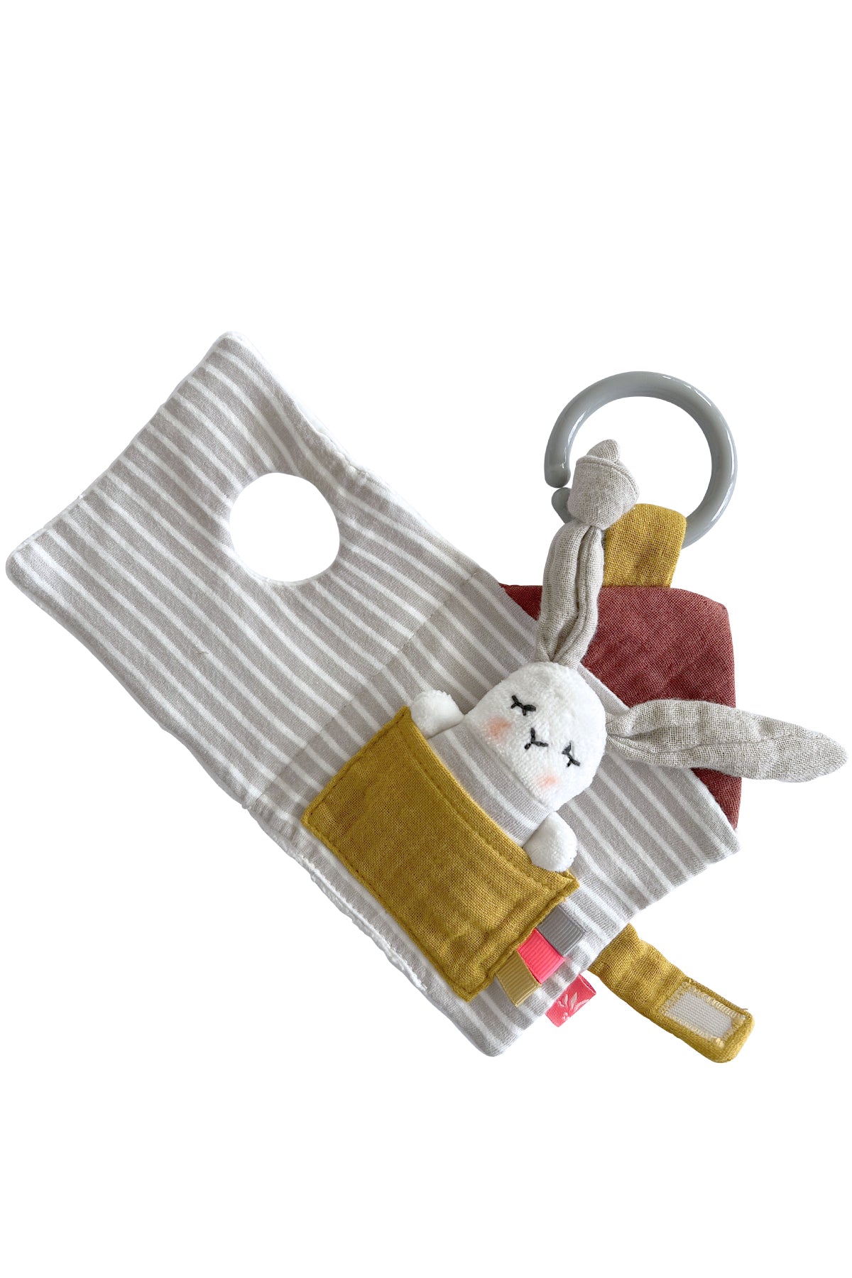 Aus dem kleinen Hasenhausbuch von Kikadu schaut ein kleiner Hase hervor. Rascheleffekte unter den flauschigen Stoffen, die sich unterschiedlich anfühlen, wecken die Neugier deines Babys und fördern seine Sinne. Im Inneren des Buches wartet ein Hasen-Püppchen darauf von deinem Baby entdeckt zu werden. Das Hasenbuch ist ein super Begleiter für unterwegs und kann, dank des Rings, am Kinderwagen oder dem Autositz angebracht werden. So kann sich dein Baby jederzeit und überall daran erfreuen.