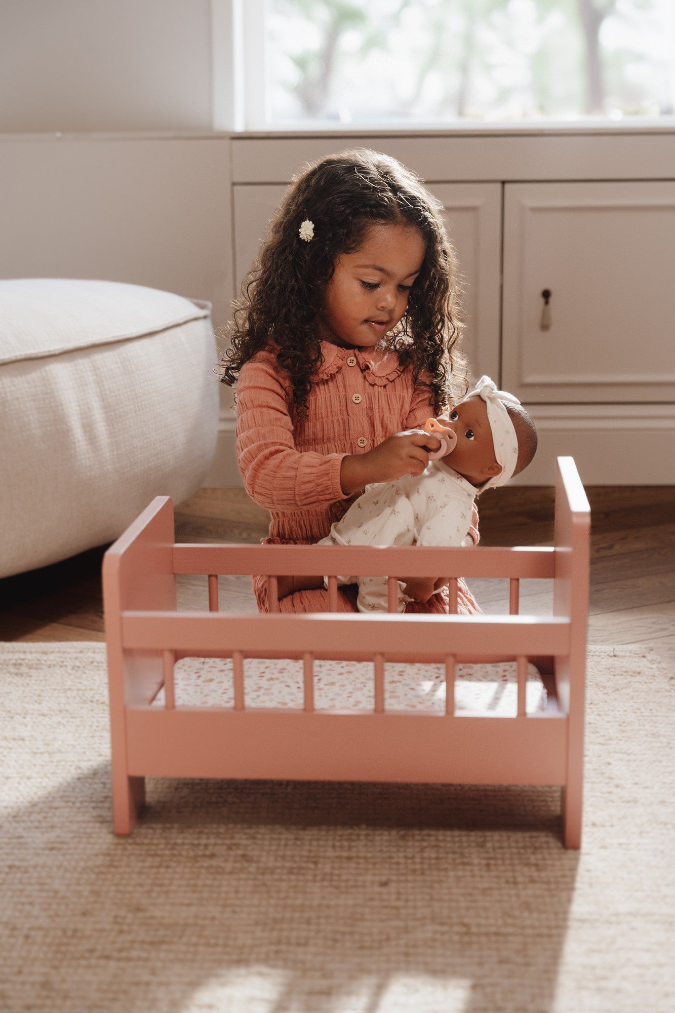 Noa trägt ein süßes Outfit bestehend aus einem Haarband, einem Kleidchen, einer Hose mit dem White Meadows-Muster und einer zartrosa Strickjacke.