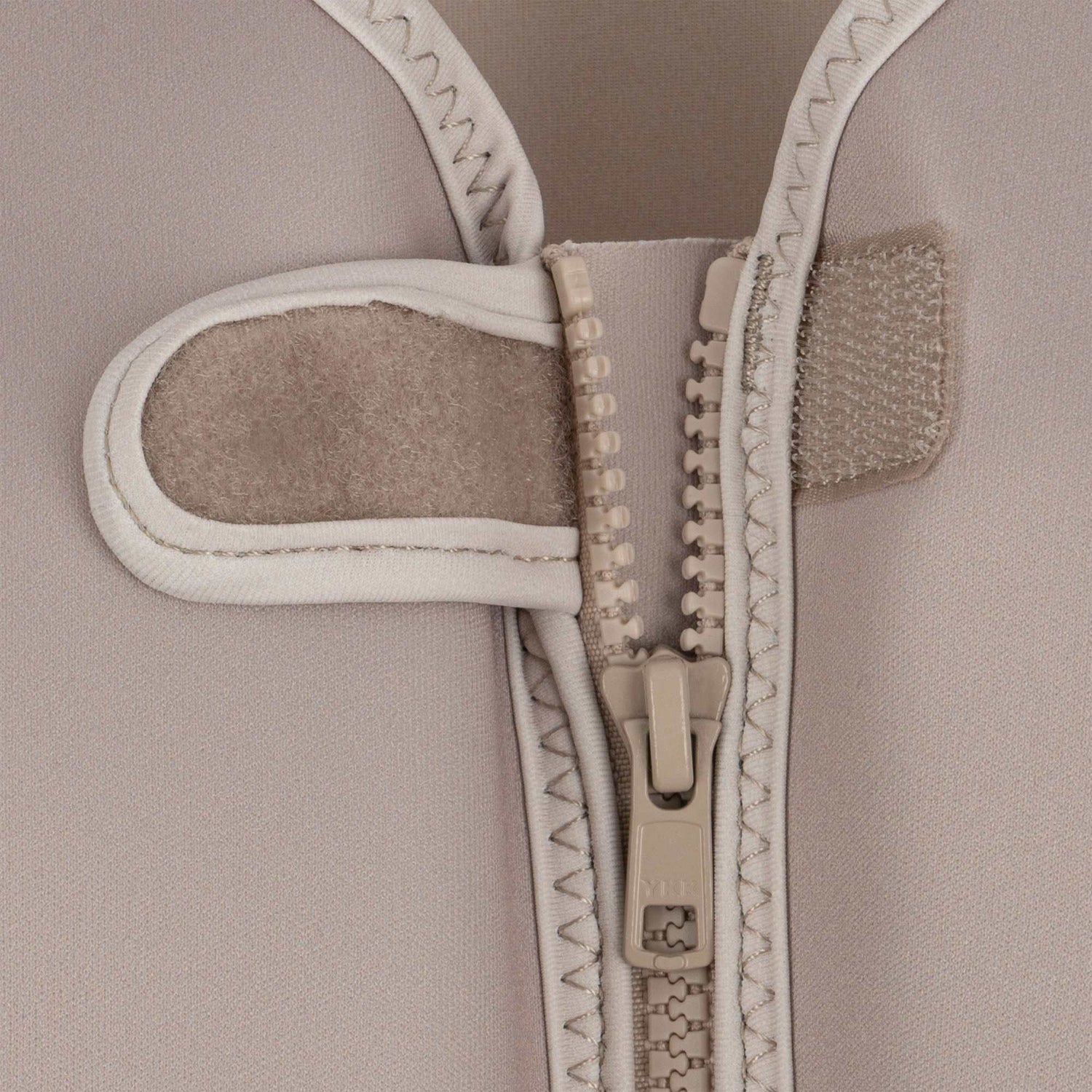 Die Weste ist mit einem Reißverschluss als auch mit Klettverschluss versehen. Zusätzlich gibt es einen Sicherheitsgurt im Schritt, damit das Kind nicht aus der Weste herausrutschen kann.
