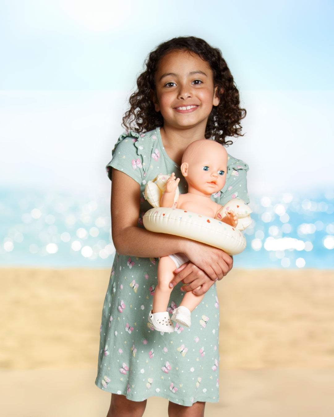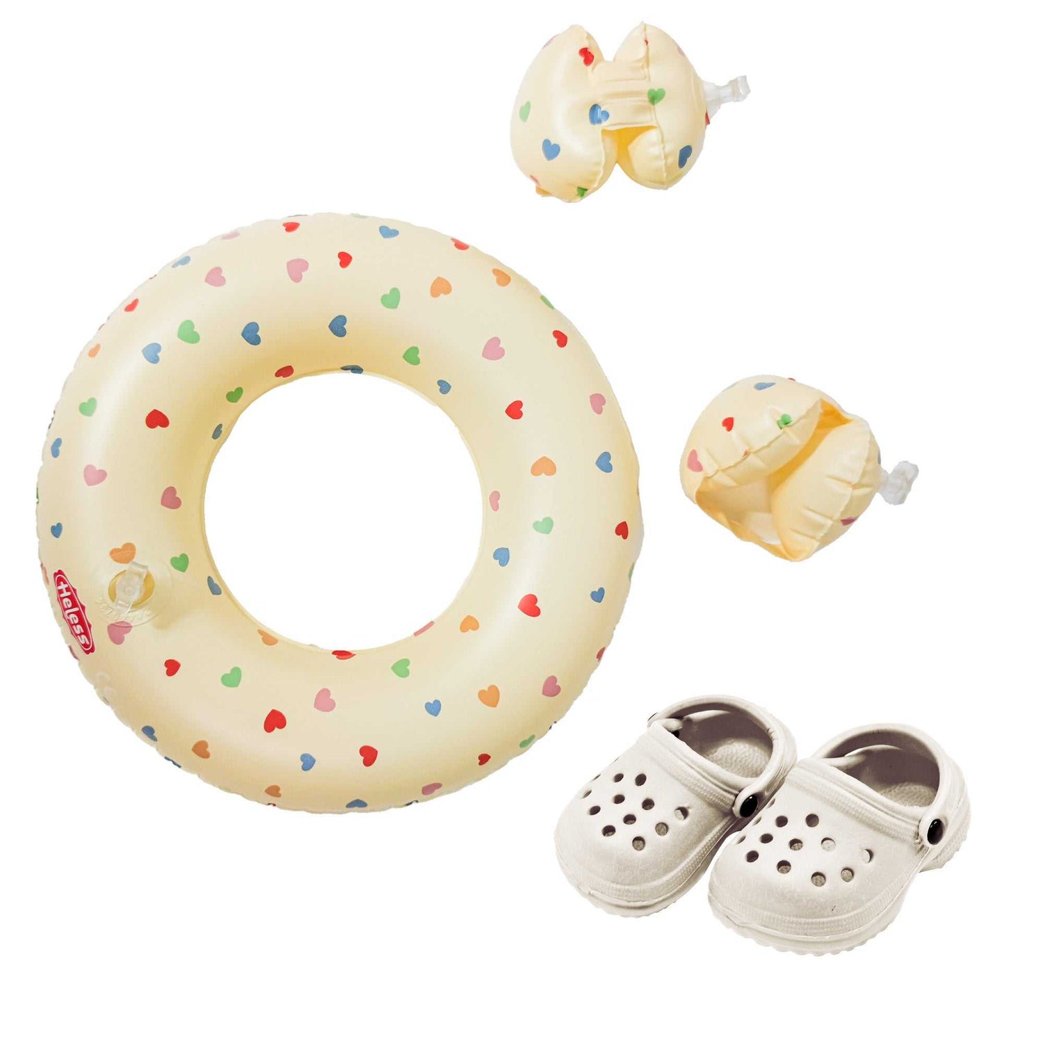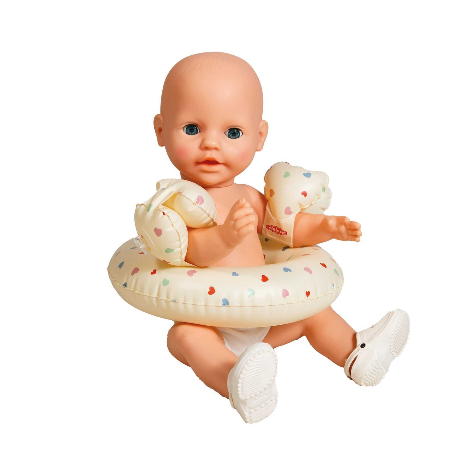 Mit diesem liebevoll gestalteten Schwimmset von Heless, können Puppen und Plüschtiere stilvoll in jedes Badevergnügen eintauchen! Ob im Planschbecken, in der Badewanne oder am Strand – das Set enthält alles, was für sommerliche Wasserabenteuer gebraucht wird: einen Schwimmring, herzförmige Schwimmflügel und passende Badeclogs in sanftem Beige. Das dezente Farbschema und der fröhliche Herzchen-Print machen das Set zu einem echten Blickfang – ganz gleich, welches Badeoutfit getragen wird. Ideal für kreatives Spielen rund ums Thema Wasser und perfekt kombinierbar mit vielen weiteren Puppenaccessoires von Heless. Modell: 550 Alter: Ab 3 Jahren Design: Herz-Konfetti Farben: Beige mit buntem Herzchen-Print Passend für: Puppen mit Größe 35–45 cm Einsatzmöglichkeiten: Für Planschbecken, Badewanne, Strand & Pool Inhalt: Puppen-Schwimmring, herzförmige Schwimmflügel, Puppen-Badeclogs Material: Clogs: 100 % EVA, Schwimmring und Schwimmflügel: Kunststoff Verpackung: Dieses Produkt ist in einem Polybeutel verpackt.