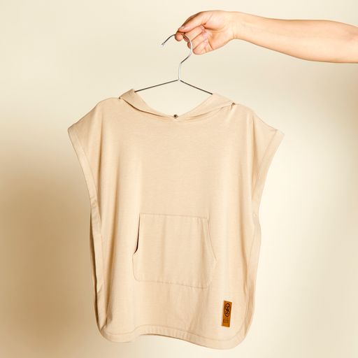 Der Poncho ist mit seiner Kapuze und einer Tasche vorne megapraktisch und mit den 2 Druckknöpfen unter dem Arm bleibt er auch an Ort und Stelle.