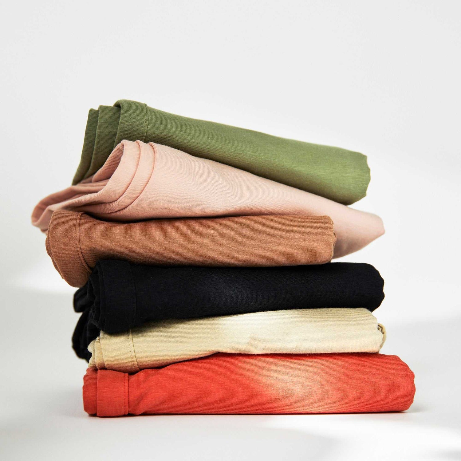 * 52 % Bio-Baumwolle, 43 % Viskose aus Bambus, 5 % Elasthan