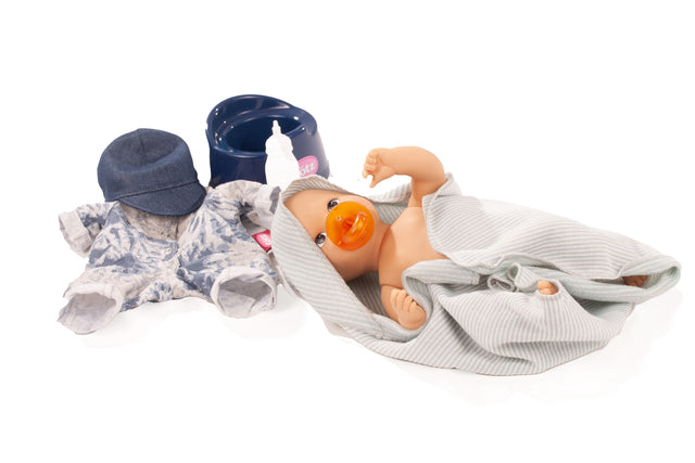 Das Set beinhaltet neben der Puppe auch einen Overall, eine Cap, ein Töpfchen, ein Badetuch, eine Trinkflasche und einen Schnuller. Der Aquini-Boy hat einen Hartkörper aus Vinyl, der abwaschbar ist und somit auch für ausgiebige Badesessions geeignet ist. Die Puppe hat eine Größe von 33 cm und trägt Kleidergröße S.