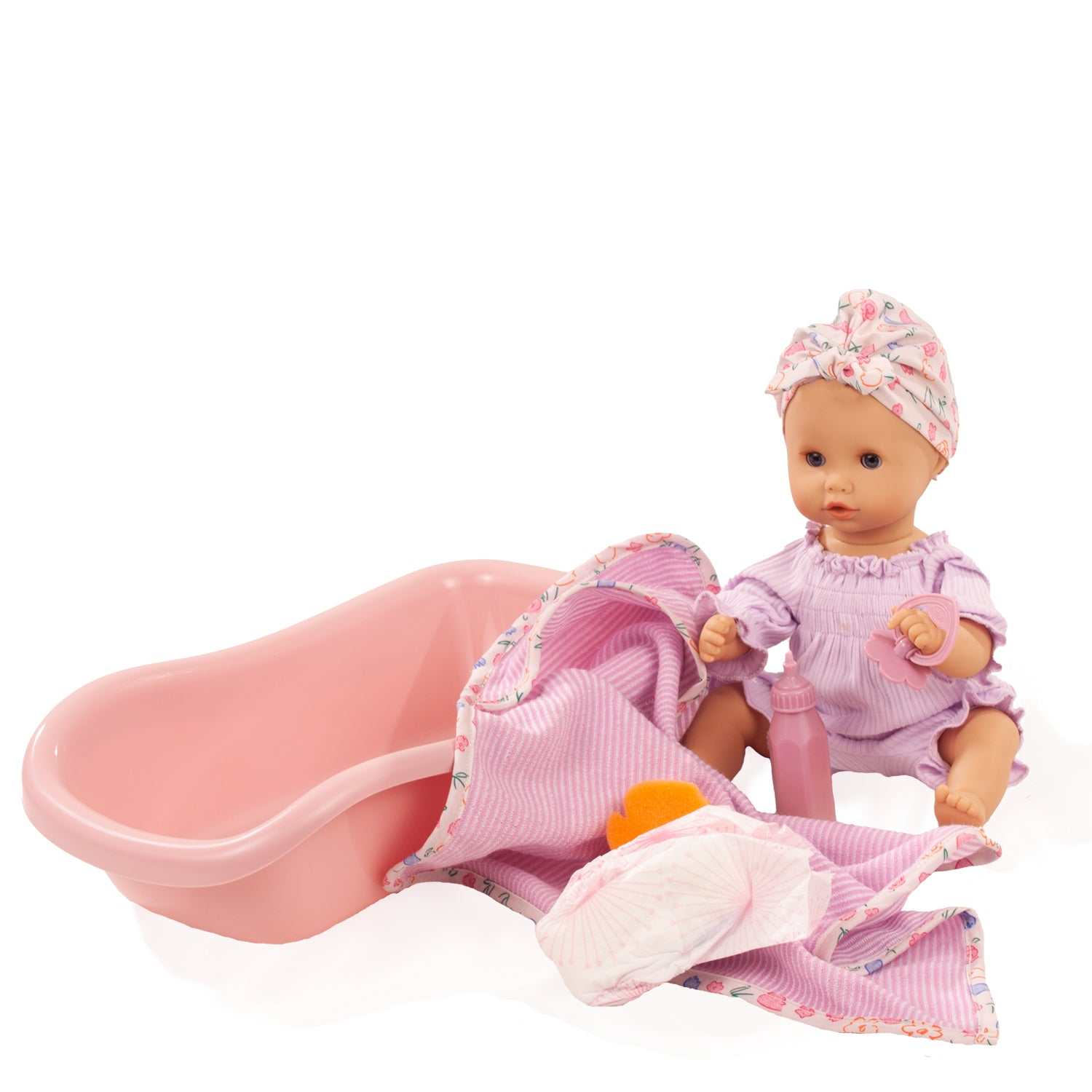 Ihre Badewanne mit Badeschwämmchen und ein schickes Kapuzenhandtuch mit.