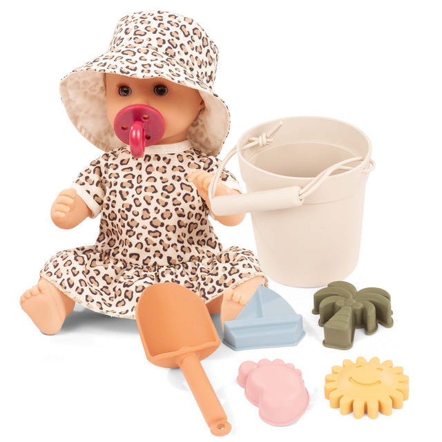 Es enthält die entzückende Badepuppe Sleepy Aquini Mädchen mit Schlafaugen, die ein cooles Sommerkleid im Tiger-Look trägt. Perfekt für einen Tag am Strand ist das hochwertige Sandspielzeug aus Silikon, bestehend aus einem Spieleimer, einer Schaufel und vier Sandformen.