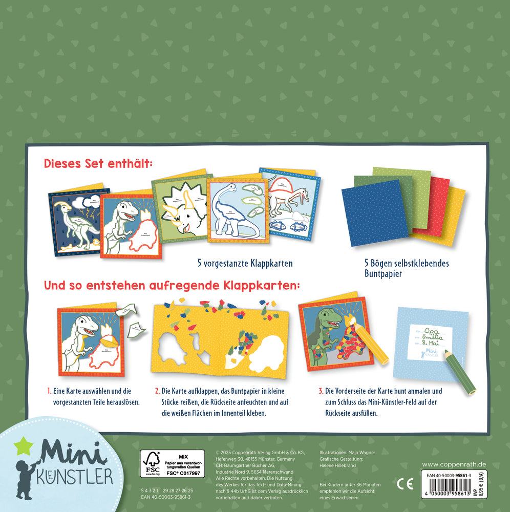 Erstes Kreativset für unsere Allerkleinsten von Coppenrath. Alles-schon-drin-Set mit 5 Klappkarten und selbstklebendem Buntpapier. So entstehen tolle Bilder: 1. Eine Karte auswählen und die vor gestanzten Teile herauslösen. 2. Die Karte aufklappen, Buntpapier in kleine Stücke reißen, Rückseite anfeuchten und auf die weiße Fläche im Innenteil der Karte kleben. 3. Die Vorderseite der Karte bunt anmalen und das Feld auf der Rückseite ausfüllen. Fertig!