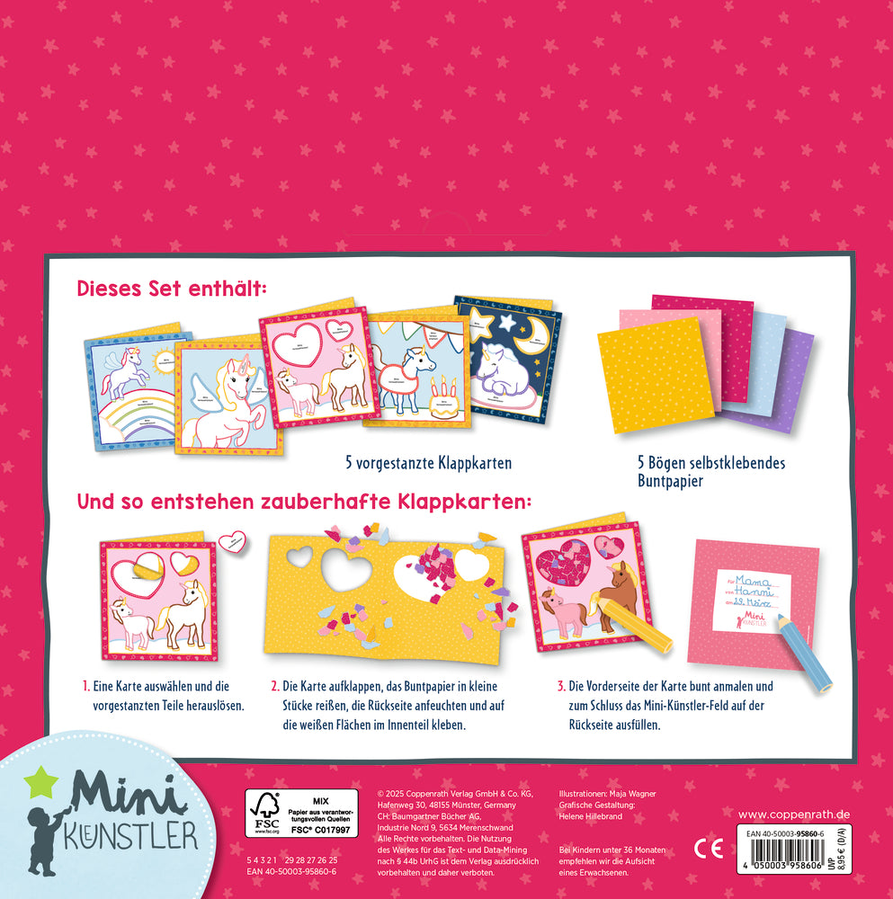 Erstes Kreativset für unsere Allerkleinsten von Coppenrath. Alles-schon-drin-Set mit 5 Klappkarten und selbstklebendem Buntpapier. So entstehen tolle Bilder: 1. Eine Karte auswählen und die vor gestanzten Teile herauslösen. 2. Die Karte aufklappen, Buntpapier in kleine Stücke reißen, Rückseite anfeuchten und auf die weiße Fläche im Innenteil der Karte kleben. 3. Die Vorderseite der Karte bunt anmalen und das Feld auf der Rückseite ausfüllen. Fertig!