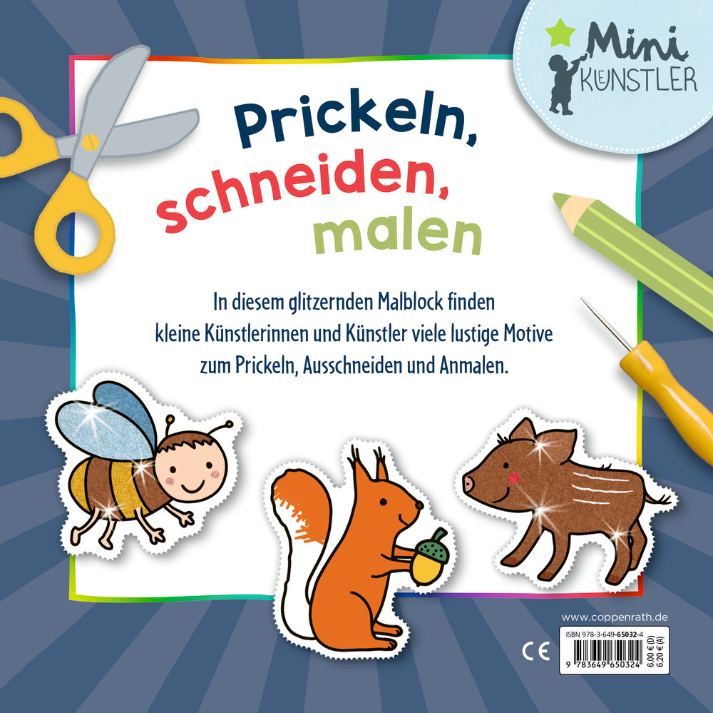In diesem fröhlichen Malblock von Coppenrath warten 32 lustige Motive darauf, von kleinen Künstlerinnen und Künstlern ausgeprickelt und kunterbunt angemalt zu werden. Mit 16 farbigen Glitzerseiten.