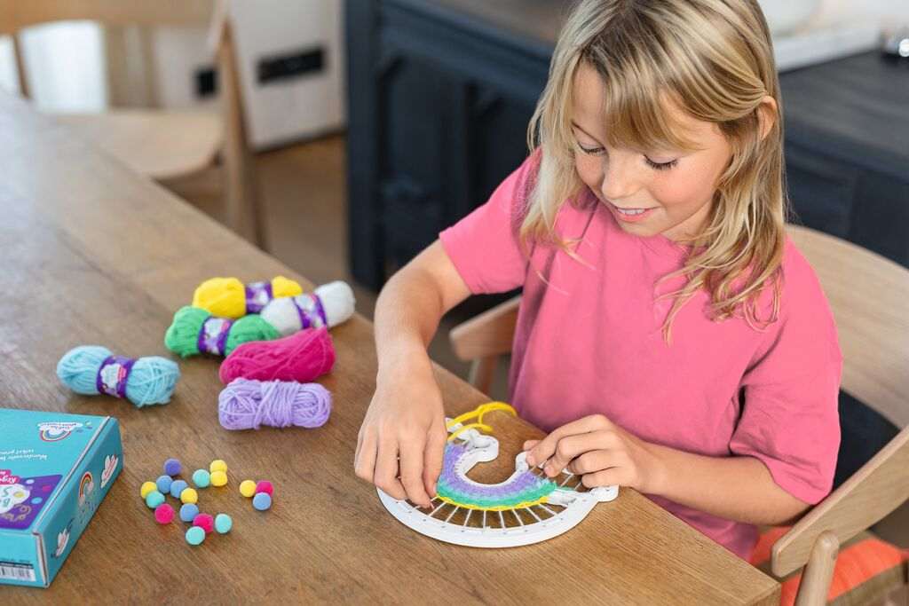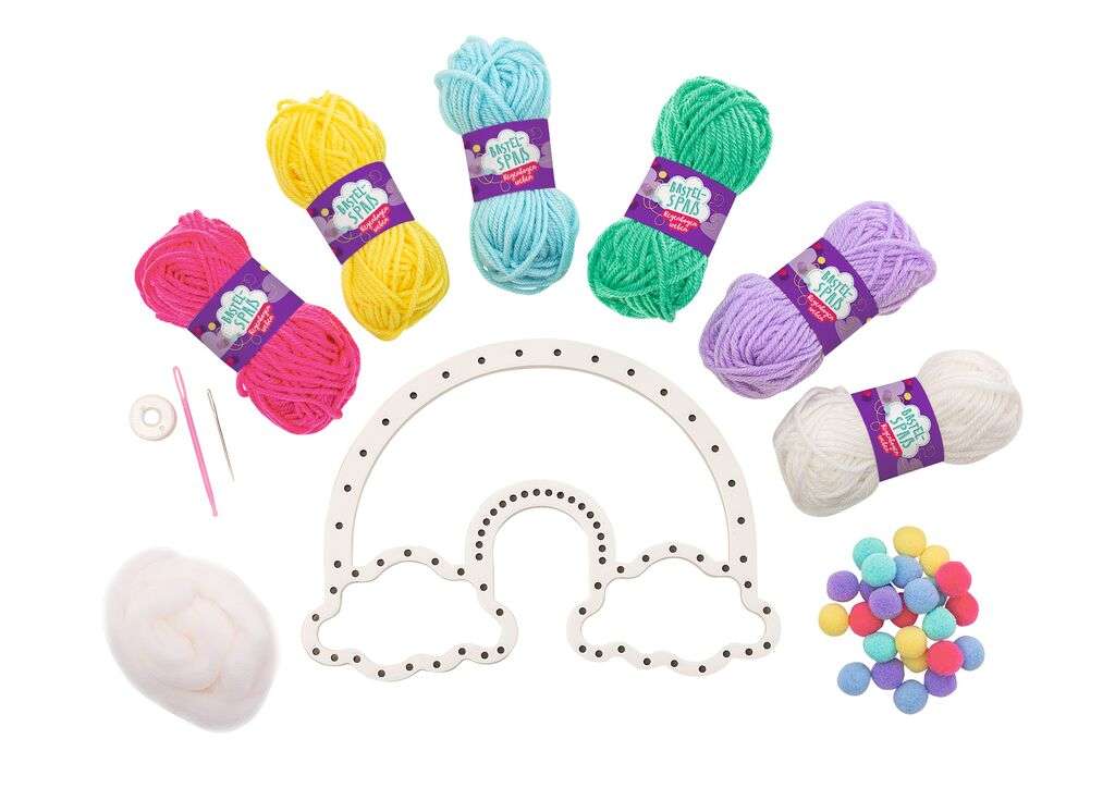 Das Bastelspaß-Set lässt kreative Kinder ihren eigenen Regenbogen weben. Das bunte Garn in Regenbogenfarben kann kinderleicht in einen fertig zugesägten und lackierten Holzrahmen in Regenbogen-Form gewebt werden und anschließend mit bunten Pompons und flauschigen Wolle-Wolken verziert werden. Die fertige Wand-Deko kann danach über dem Bett, dem Schreibtisch oder dem Bücherregal aufgehängt werden und sorgt immer für gute Laune.