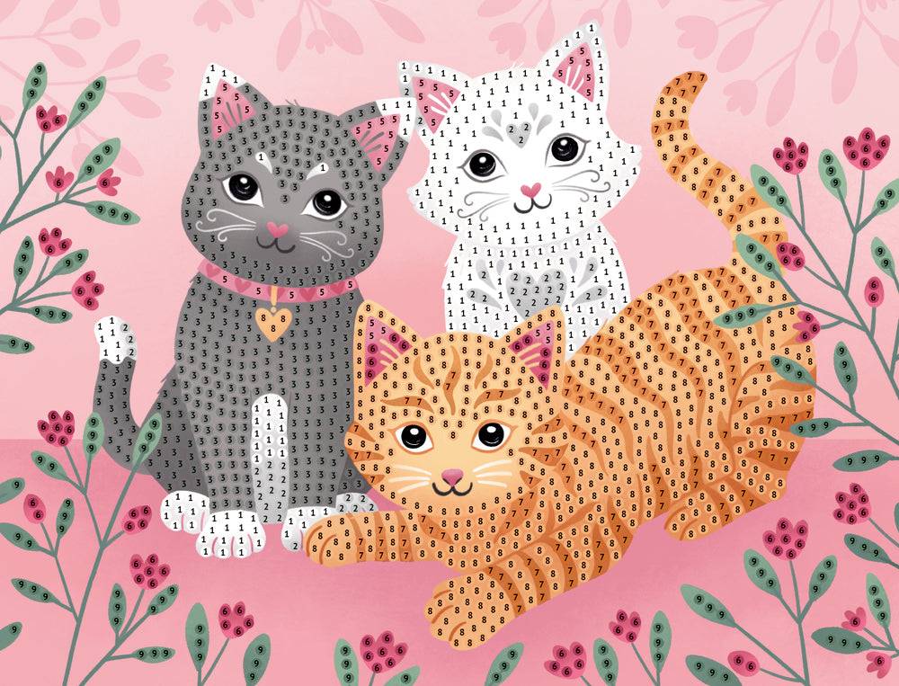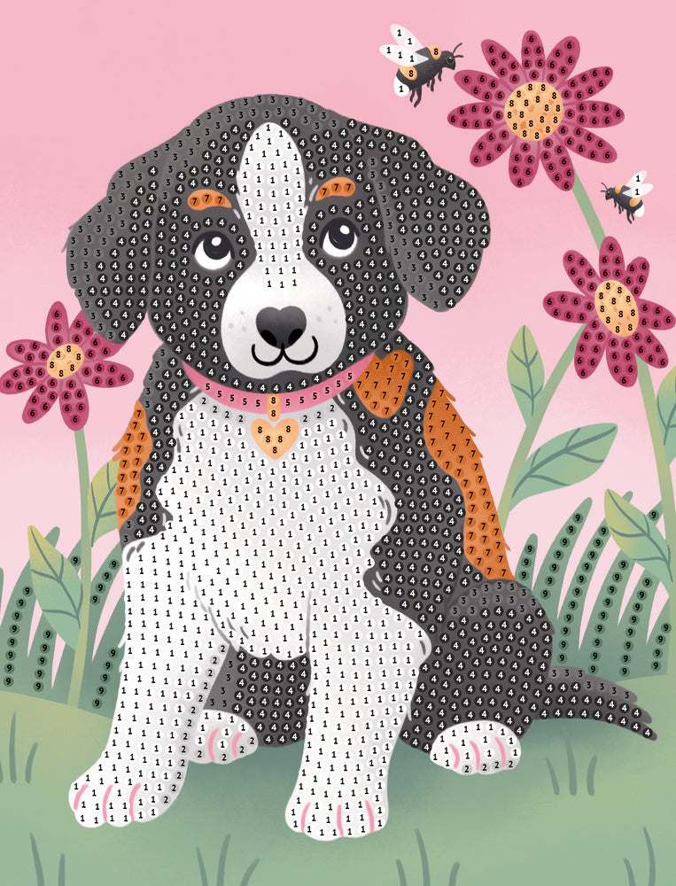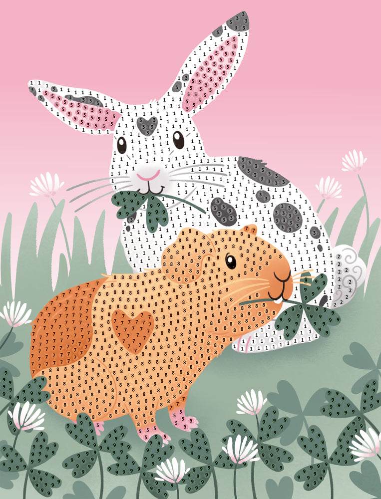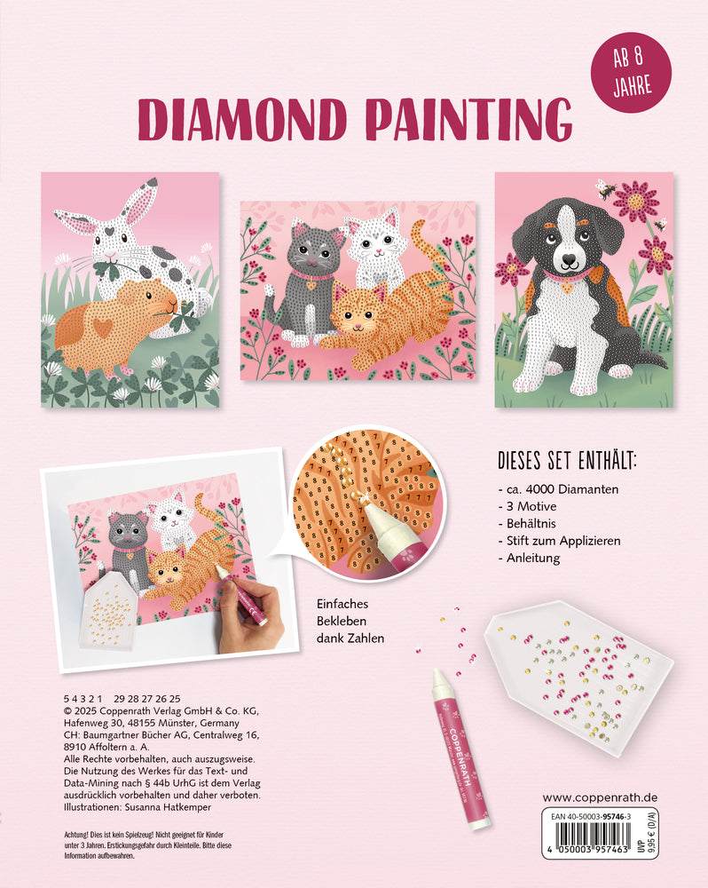 Ein Kreativ-Set mit über 4000 Diamanten, 3 Motiv-Vorlagen mit niedlichen Tierchen, 1 Behältnis, 1 Stift zum Applizieren und Anleitung.