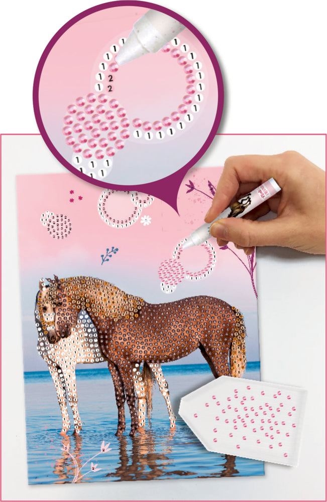 Die Karten bestehen aus stabilem Karton mit selbsthaftender Oberfläche, die das Anbringen der funkelnden Diamanten kinderleicht macht.