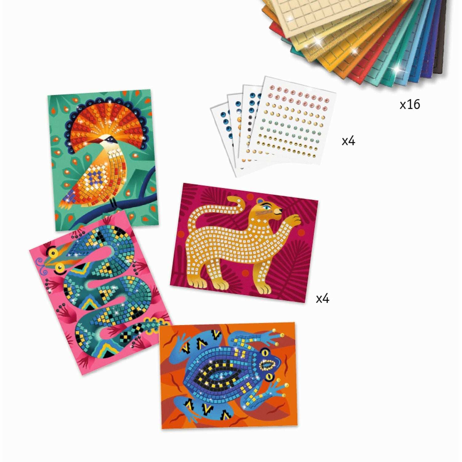 Die Mosaik Bilder „Im Herzen des Dschungels“ DJ09422 von Djeco mit farbenfrohen selbstklebenden Mosaik- Stickern zum selbst gestalten und dekorieren. Hier ist Kreativität, Fingerfertigkeit und Geduld gefragt. Mit Hilfe von zahlen werden die Mosaiksteine aufgeklebt. Absolutes Highlight sind die zusätzlichen funkelnden Glitzersteine. Für kleine Dschungelforscher ab 7 Jahren (7-13 Jahre).