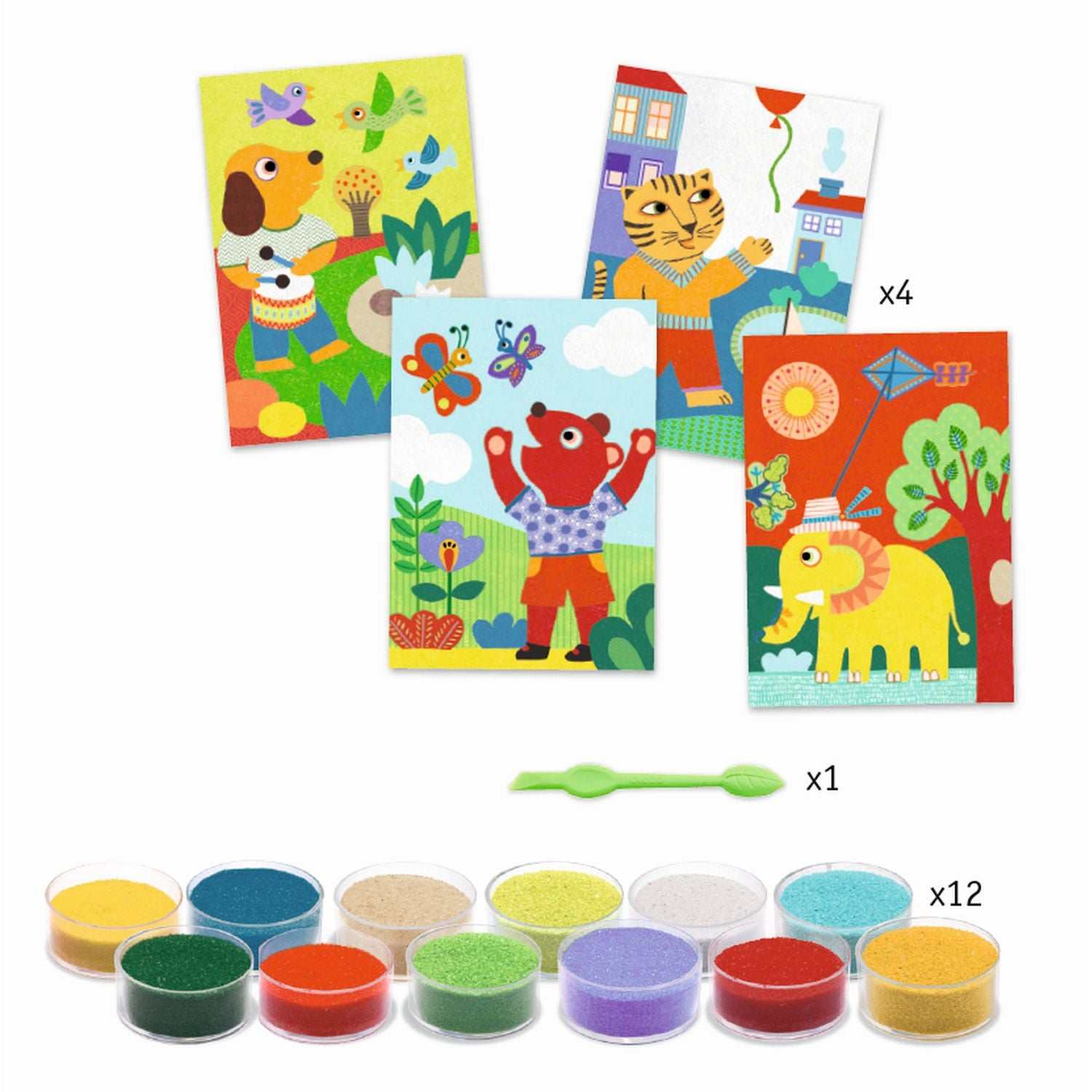 Mit den kunterbunten Sandbildern „Im Freien“ DJ08660 von Djeco entstehen wunderbar schillernde Bilder. Nach Anleitung werden Klebeflächen freigelegt und mit farbigem Sand bestäubt. Hier ist Kreativität, Fingerfertigkeit, Geduld und genaues Hinschauen gefragt. Für kleine Bastelliebhaber ab 5 Jahren (5-8 Jahre)