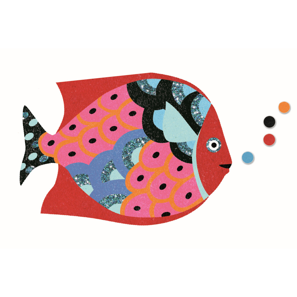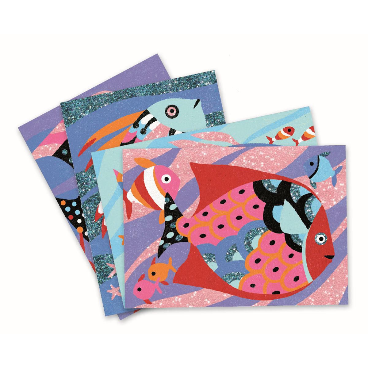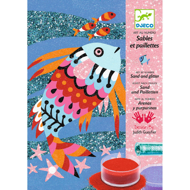 Mit den kunterbunten Sandbildern „Regenbogenfische“ DJ08639 von Djeco entstehen wunderbar schillernde Tiere. Nach Anleitung werden Klebeflächen freigelegt und mit farbigem Sand bestäubt. Hier ist Kreativität, Fingerfertigkeit, Geduld und genaues Hinschauen gefragt.