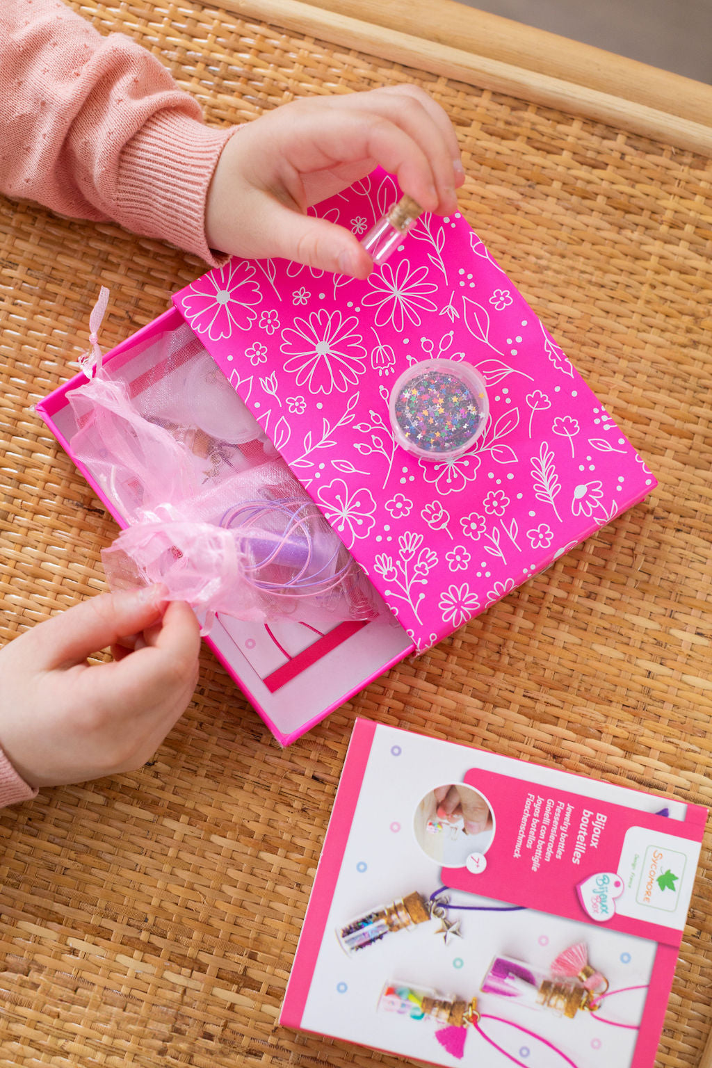 Das kleine Schmuckset von Sycomore ist ein kreatives Bastelset für Kinder ab 7 Jahren, um originelle Modeaccessoires herzustellen.