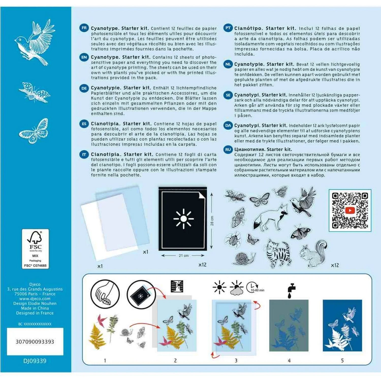 Das Starter-Set enthält alles, was benötigt wird, um die ersten Schritte in der Cyanotypie zu machen. Es handelt sich um eine einfache Aktivität ohne chemische Produktmischungen, die dank des Druckens von Motiven auf Rhodoid-Kunststoff eine neuartige Erfahrung bietet. Jede Kreation ist einzigartig und die Ergebnisse sind magisch und poetisch.