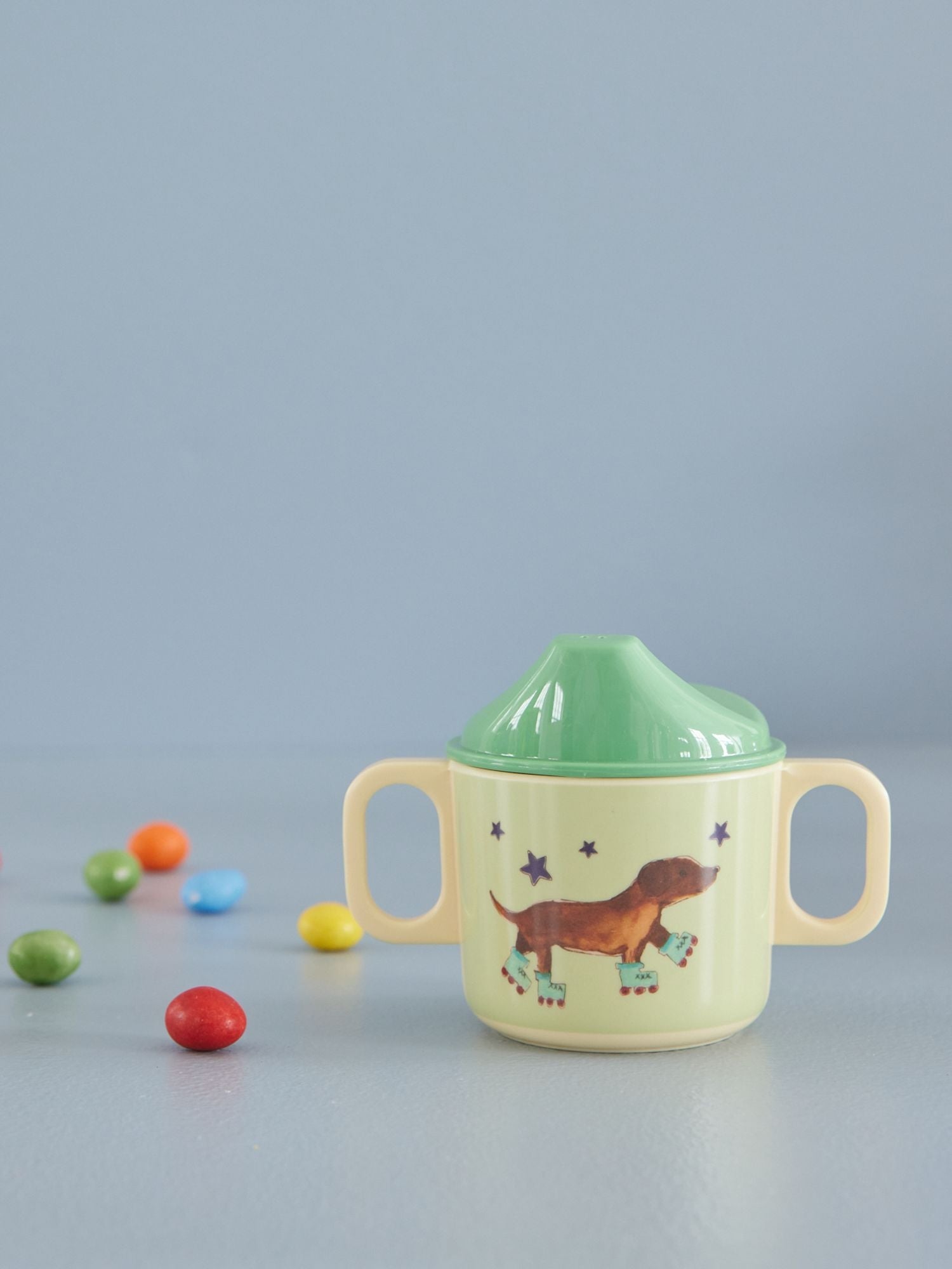 Babybecher aus Melamin von Rice für die jüngsten Familienmitglieder. Mit einem praktischen grünen Schnabeldeckel und Tiermotiv-Print. Die praktischen Griffe erleichtern es deinem Kind den Becher unter Kontrolle zu halten und der Deckel stellt sicher, dass die Flüssigkeit im Becher bleibt. Eine niedlicher und praktischer Becher für den Start.