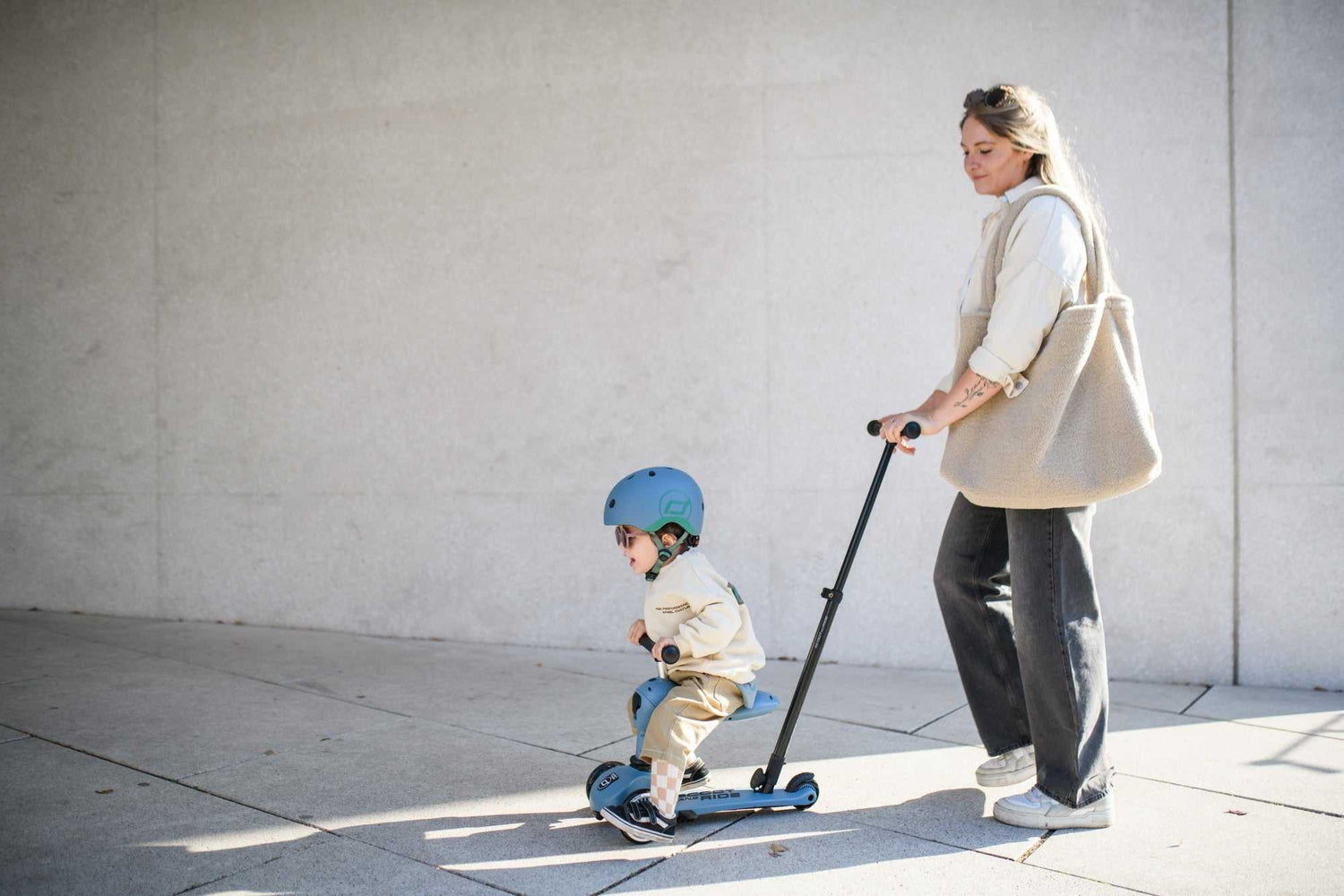 Nun ist es möglich die Kinder im Alter zwischen ein und drei Jahren bequem, sowohl sitzend als auch stehend, am Roller zu schieben.