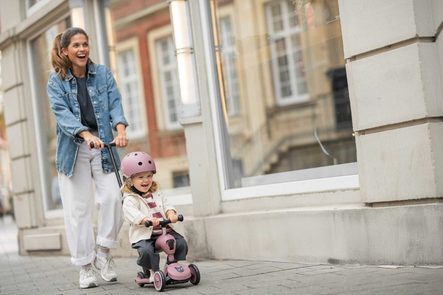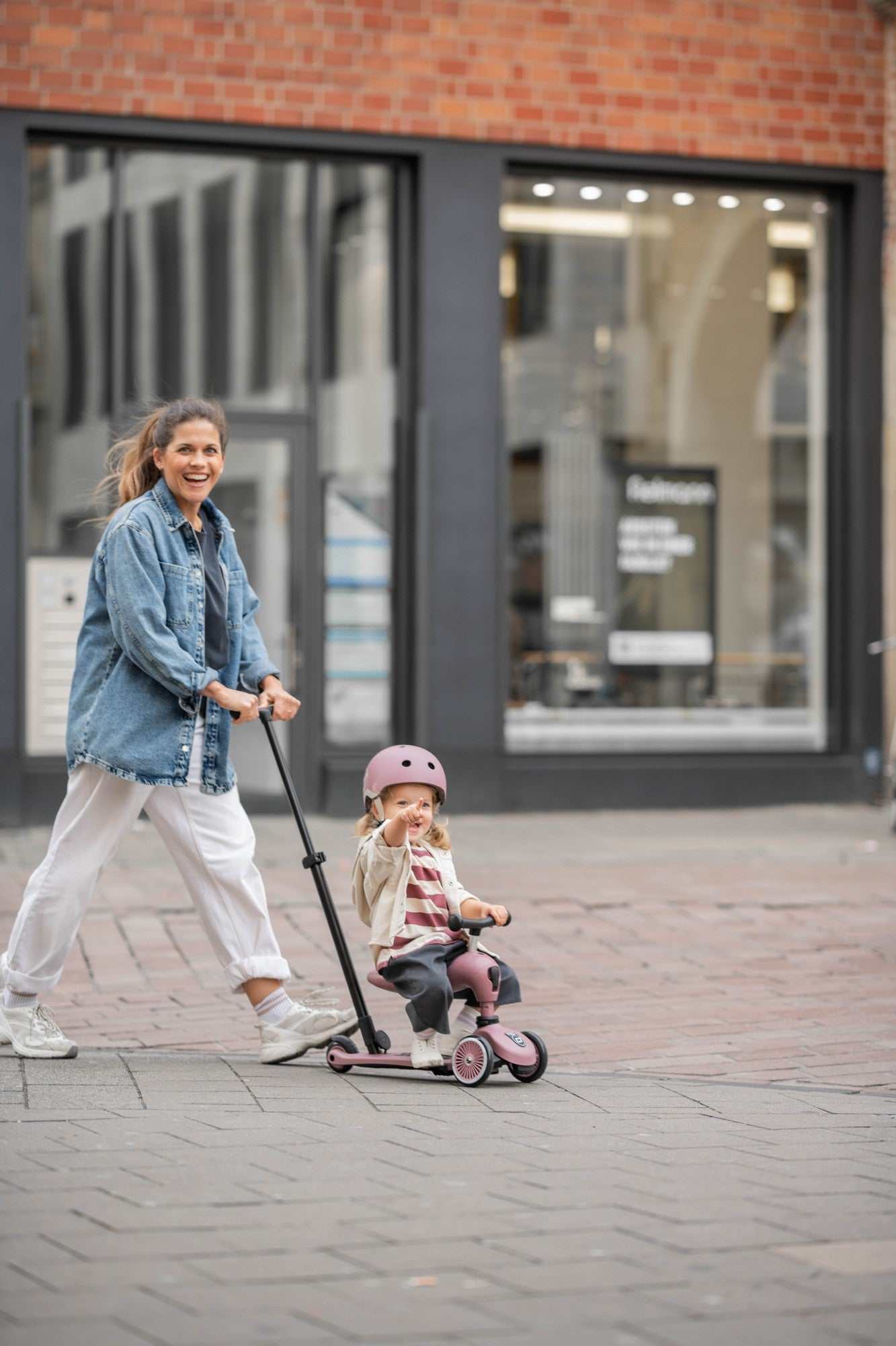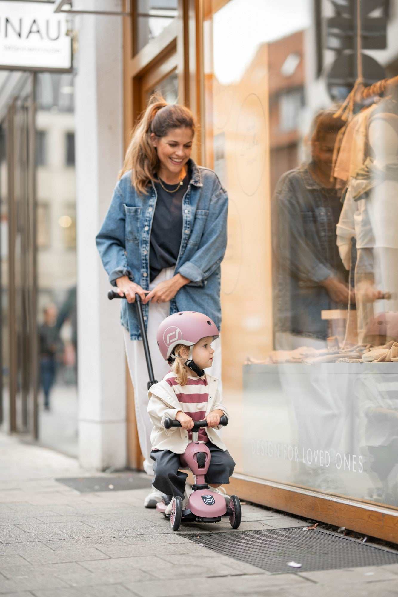 Nun ist es möglich die Kinder im Alter zwischen ein und drei Jahren bequem, sowohl sitzend als auch stehend, am Roller zu schieben.