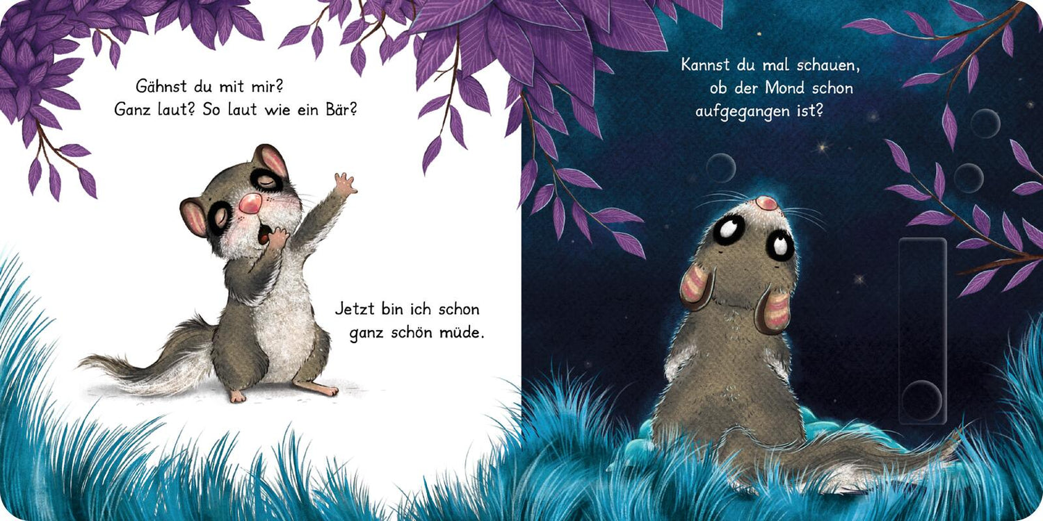 Der kleinen Siebenschläfer ist sooo müde, aber wer bringt ihn ins Bett? Diese interaktive Schiebepappe macht das Einschlafen zu einem zauberhaften Ritual, bei dem das Kind mithelfen kann. Zuerst werden dem kleinen Siebenschläfer die Zähne geputzt, dann zählen wir gemeinsam Schäfchen. Das Kind wiegt ihn sanft in seinem Schnuffeltuch und schaut nach, ob der Mond schon aufgegangen ist. Zum Schluss wird der Siebenschläfer mit seiner Schnuffeldecke zugedeckt.