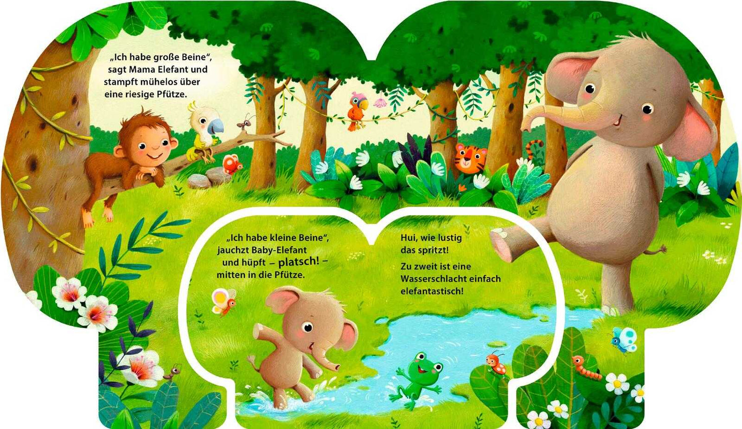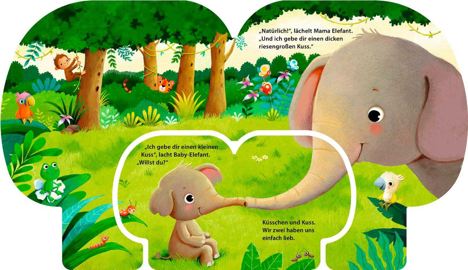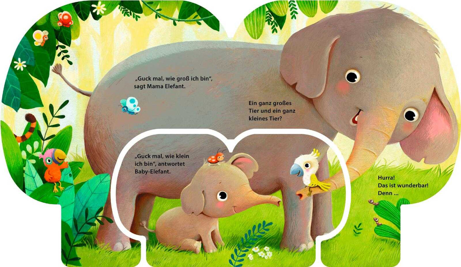 Wunderschöne Liebeserklärung an alle Mamas & ihre Kinder! Diese konturgestanzte Pappebuch bringt eine Überraschung mit: Ein zweites kleines Pappebuch ist im Buchrücken integriert und kann eigenständig geblättert werden. Das sorgt für doppelten Lesespaß für Kinder ab 18 Monaten! Mama Elefant ist soooo groß und erreicht deshalb alle Früchte. Baby-Elefant ist soooo klein und findet daher die zartesten Gräser. Von Baby-Elefant bekommt man ein kleines, sanftes Küsschen. Und von Mama Elefant? Einen richtig großen dicken Kuss! Groß und klein - einfach unzertrennlich - herzerwärmendes Pappebuch für eine gemeinsame Kuschel-Vorlesezeit! Seiten: 12 Maße: 19 x 22 cm Material: Pappe Altersempfehlung: ab 2 Jahre