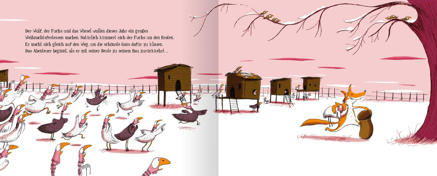 In der Geschichte treffen der Wolf, der Fuchs und das Wiesel auf eine Gans, die eigentlich als Braten enden sollte.