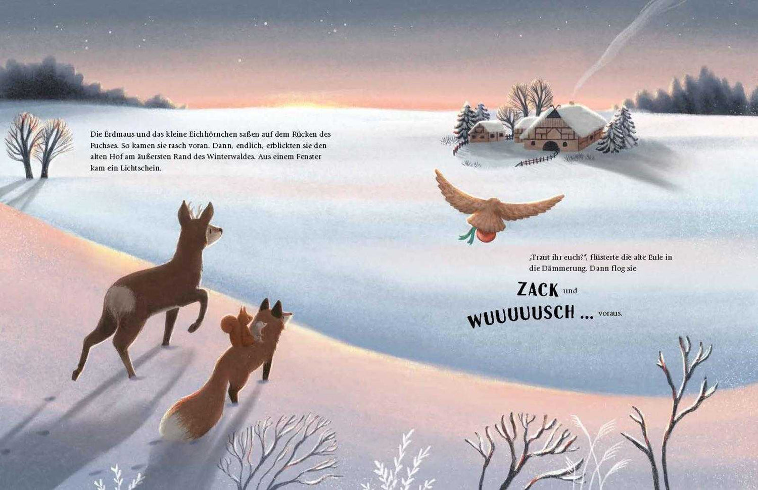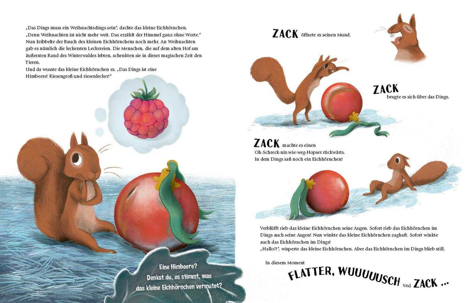 Das Eichhörnchen seufzt vor Glück, als es auf dem Waldboden ein glitzerndes Etwas entdeckt, dunkelrot und kugelrund. Ob das wohl eine besonders große Himbeere ist? Aber doch nicht mitten im Winter! Zusammen mit den anderen Waldtieren versucht das Eichhörnchen herauszufinden, was das Weihnachtsdings für eine Funktion hat. Und am liebsten möchte es jeder für sich allein beanspruchen. Großherzig bringen sie es schließlich dahin zurück, wo es von zwei Geschwisterkindern schon sehnlich vermisst wird: an den Tannenbaum.