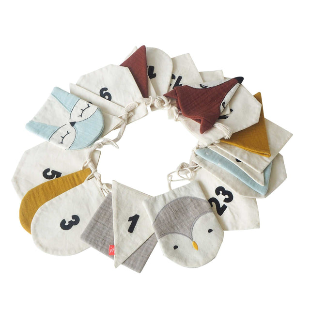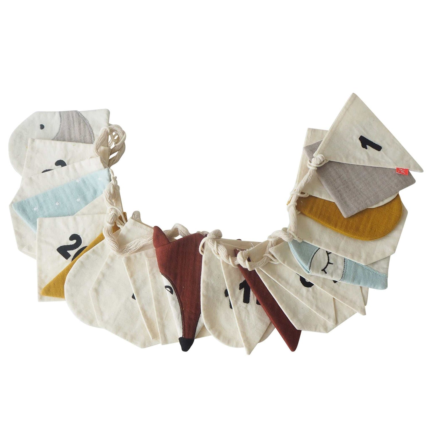 Die niedlichen Stoffbeutel, die an der Girlande befestigt sind, sind entweder mit Zahlen oder kindgerecht gestalteten Waldtieren verziert.