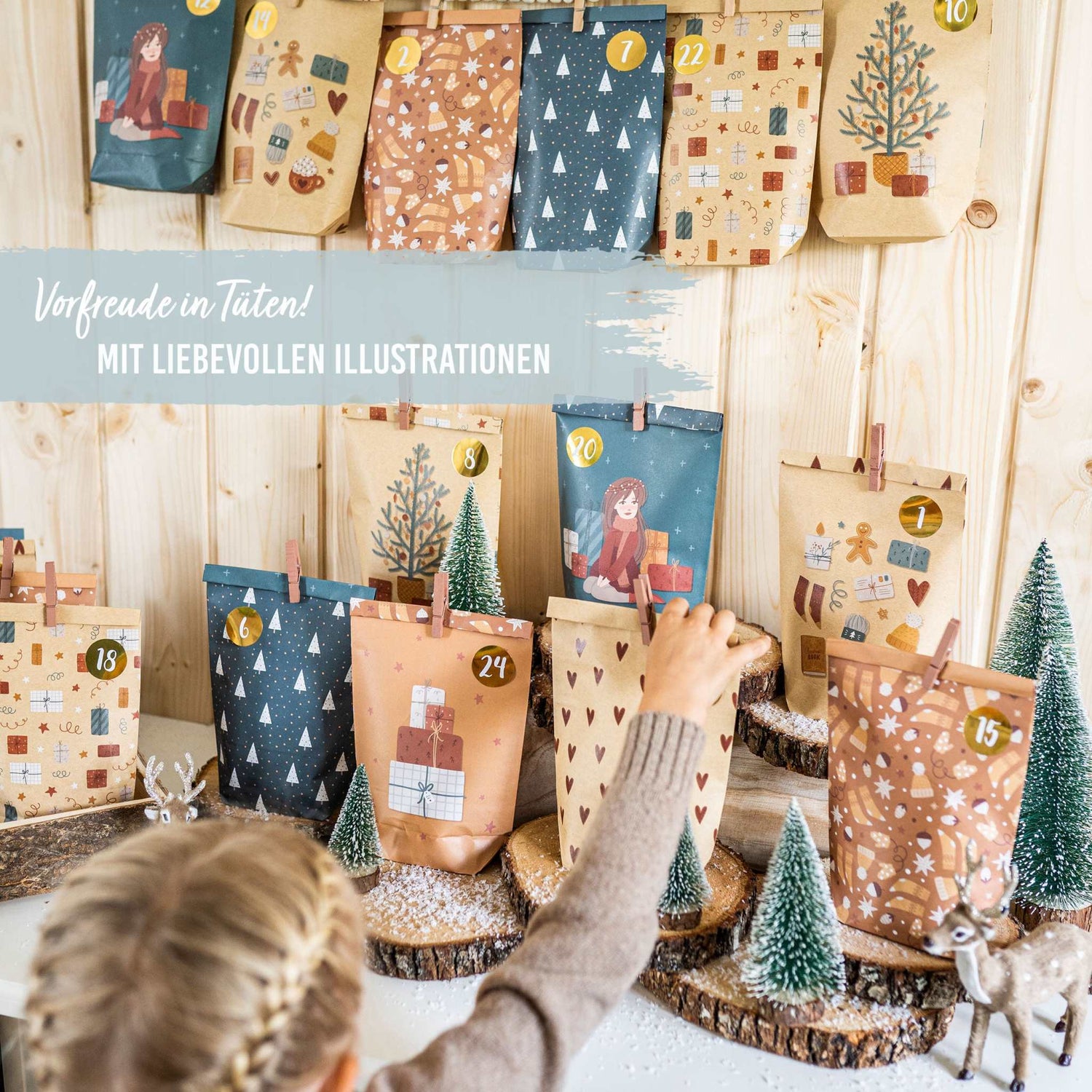 Die Papiertüten, Zahlenaufkleber und Holzklammern sind bereits enthalten, sodass der Bastelspaß sofort losgehen kann.