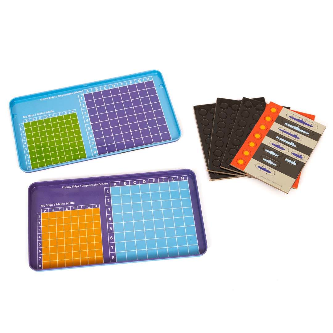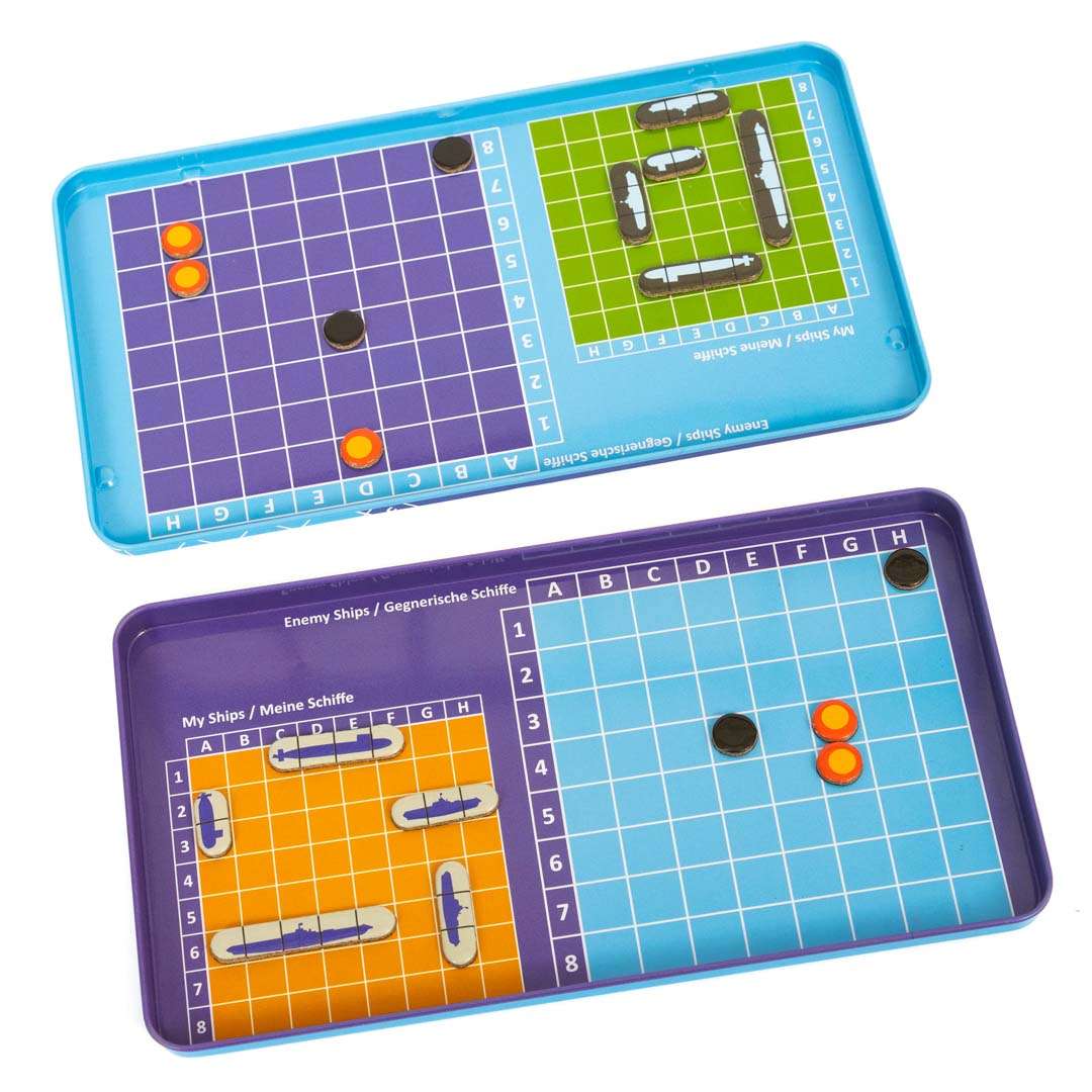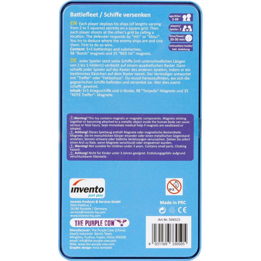 Beliebter Spiele-Klassiker von Invento just play. Das Magnetspiel in hochwertiger Metalldose – attraktiv, stabil, praktisch. Ein spaßiger Zeitvertreib für Zuhause oder unterwegs. Dank der praktischen Magnete bleibt alles an seinem Platz. Ein schönes und sehr preiswertes Geschenk für jeden Anlass! Das klassische Strategiespiel - finde den Standort der gegnerischen Schiffe heraus und versenke die gegnerische Flotte schneller als dein Gegenspieler. Spieldauer: 20 - 30 Minuten Für 2 Spieler Alter: 5 - 99 Inhalt: 5 + 5 Kriegsschiffe und U-Boote, 98 „Torpedo“-Magnete, 35 „ROTE Treffer“- Magnete, Spielanleitung