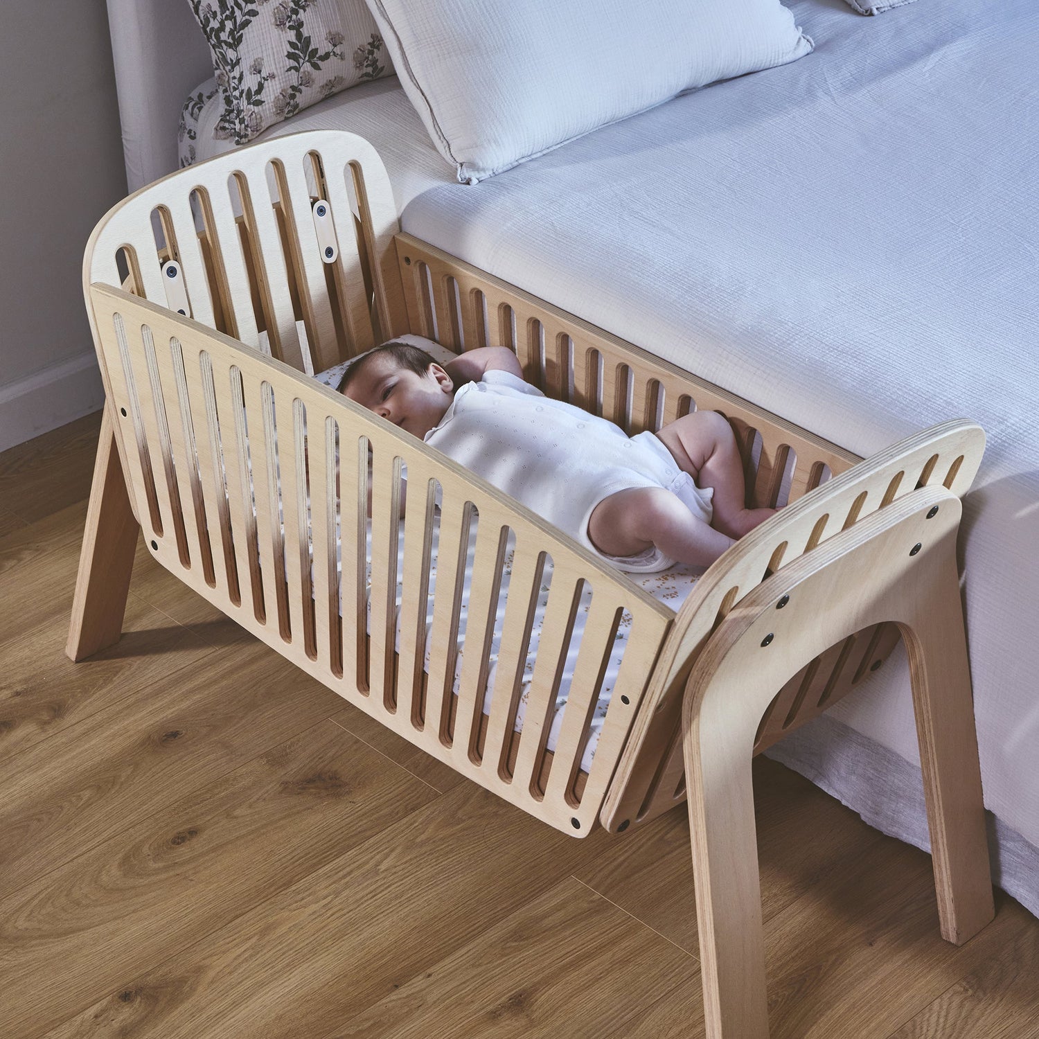 Das Beistellbett KODO von Charlie Crane bietet eine sichere und praktische Schlafumgebung für Ihr Baby. Mit seinem ansprechenden Design, das von einer aufblühenden Blume inspiriert ist, fügt sich das Beistellbett harmonisch in jedes Schlafzimmer ein. Hergestellt aus Buchenmultiplex, entspricht das Beistellbett den Sicherheitsanforderungen für Wiegen und Beistellbetten gemäß EN 1130:2019. Die Höhe des Beistellbetts ist verstellbar, um sich perfekt an verschiedene Erwachsenenbetten anzupassen, die bis zu 200 cm breit sind. Das Beistellbett KODO wird mit einer Schaumstoff/Kokosnussmatratze geliefert, die eine Größe von 70 x 40 cm hat und Ihrem Kind einen ruhigen und komfortablen Schlaf ermöglicht. Das Beistellbett kann von der Geburt an bis zu dem Zeitpunkt verwendet werden, an dem Ihr Kind selbstständig sitzen, stehen oder krabbeln kann. Die Abmessungen des zusammengebauten Beistellbetts betragen 80 x 43 x 62 cm, während die Matratze eine Dicke von 2,5 cm hat. Es ist wichtig zu beachten, dass das Beistellbett nur für Betten mit einer Matratzenhöhe zwischen 42 und 69 cm über dem Boden geeignet ist. Bitte lesen Sie vor der Verwendung des Beistellbetts die Anweisungen sorgfältig durch und verwenden Sie das Produkt nicht, wenn Sie die Sicherheitshinweise nicht beachten können. Das Beistellbett KODO von Charlie Crane bietet eine ideale Lösung für Eltern, die eine sichere und komfortable Schlafumgebung für ihr Baby schaffen möchten. Mit seinem stilvollen Design und den praktischen Funktionen ist das Beistellbett eine Bereicherung für jedes Kinderzimmer.