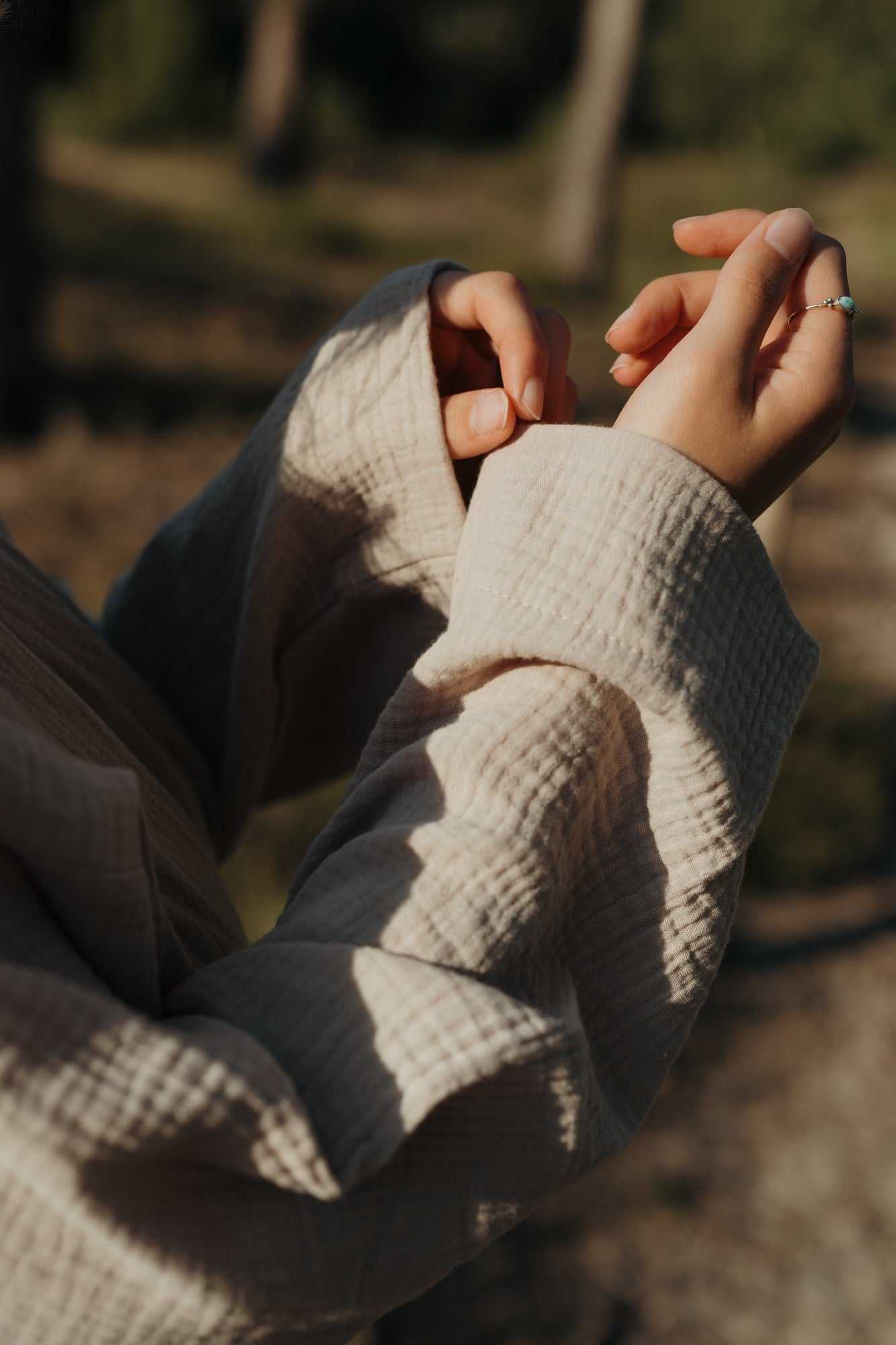 Der Moms-Kimono von Heike vom Heede x Alvi ist ein hochwertiges Kleidungsstück, das speziell für werdende Mütter entwickelt wurde. Hergestellt aus 100% Baumwolle in Musselin-Qualität, bietet er eine luftig-leichte und locker gewebte Struktur, die besonders weich und atmungsaktiv ist. Dies sorgt für ein angenehmes Tragegefühl, sowohl in der Klinik als auch zuhause in der Wohlfühloase. Dank der praktischen Taschen bietet der Kimono zusätzlichen Komfort und Funktionalität. Hier können wichtige Kleinigkeiten wie Handy, Taschentücher oder Schnuller griffbereit verstaut werden. Das lässig elegante Design in Top-Qualität macht den Moms-Kimono zu einem unverzichtbaren Begleiter für entspannte und stilvolle Momente während der Schwangerschaft und darüber hinaus. Die Pflegehinweise für den Moms-Kimono sind einfach und unkompliziert. Er kann problemlos bei 40 Grad in der Maschine gewaschen werden. Jedoch ist er nicht für den Trockner geeignet, daher empfiehlt es sich, ihn auf der Leine trocknen zu lassen. Durch die hochwertige Verarbeitung aus 100% Baumwolle in Musselin-Qualität bleibt der Kimono auch nach mehrmaligem Waschen formstabil und behält seine Weichheit bei. Der Moms-Kimono ist in der Farbe natur erhältlich und ist ein Must-have für jede Kliniktasche. Er eignet sich perfekt als Begleiter für die Zeit vor und nach der Geburt, wenn Komfort und Stil gleichermaßen wichtig sind. Mit diesem Kimono können werdende Mütter sich rundum wohlfühlen und stilvoll aussehen. Insgesamt ist der Moms-Kimono von Heike vom Heede x Alvi ein hochwertiges und praktisches Kleidungsstück, das speziell für werdende Mütter entworfen wurde. Mit seiner luftig-leichten Struktur, den praktischen Taschen und dem eleganten Design ist er ein unverzichtbarer Begleiter für entspannte und stilvolle Momente während der Schwangerschaft und darüber hinaus.
