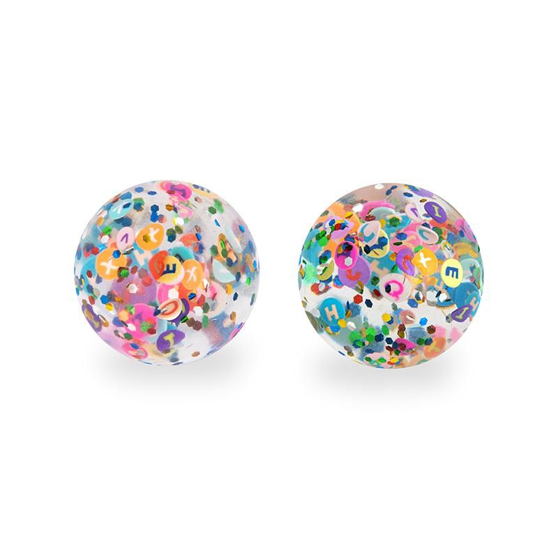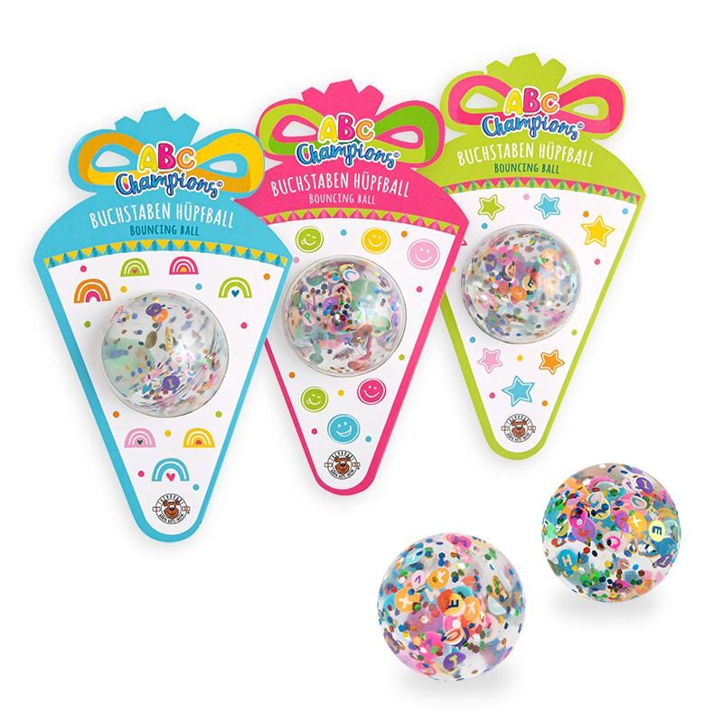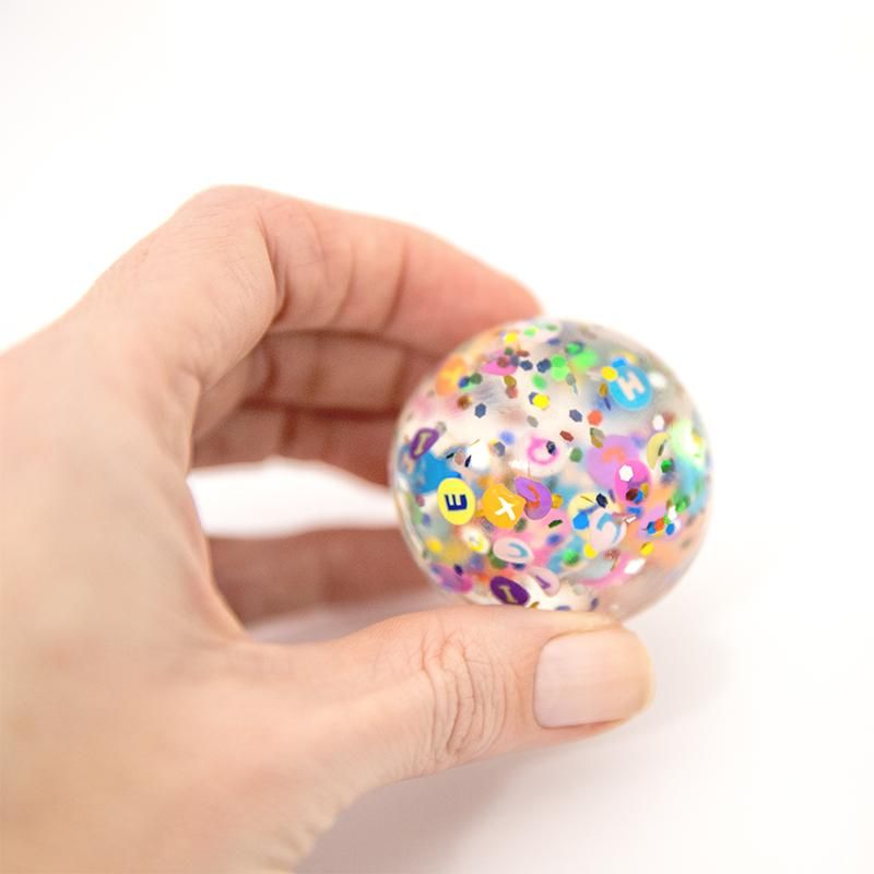 Dieser transparente Flummi mit Buchstaben- und Glitzerkonfetti sorgt für richtig viel Spaß!