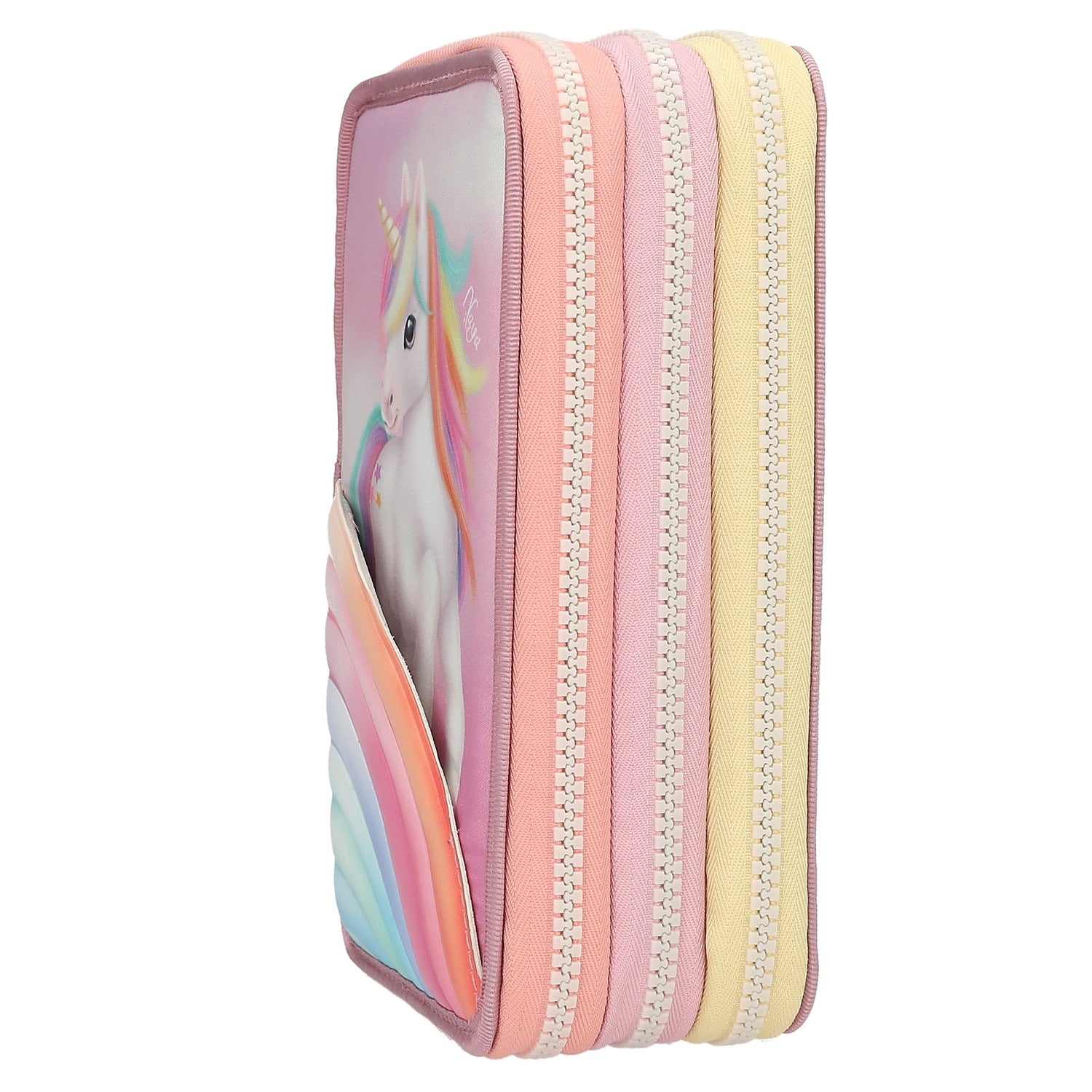 Regenbogen-Spaß: Die rosa Federtasche von Ylvi hat auf der Front ein großes Einhorn-Print und eine applizierte Wolkentasche in tollen Bonbon-Farben.